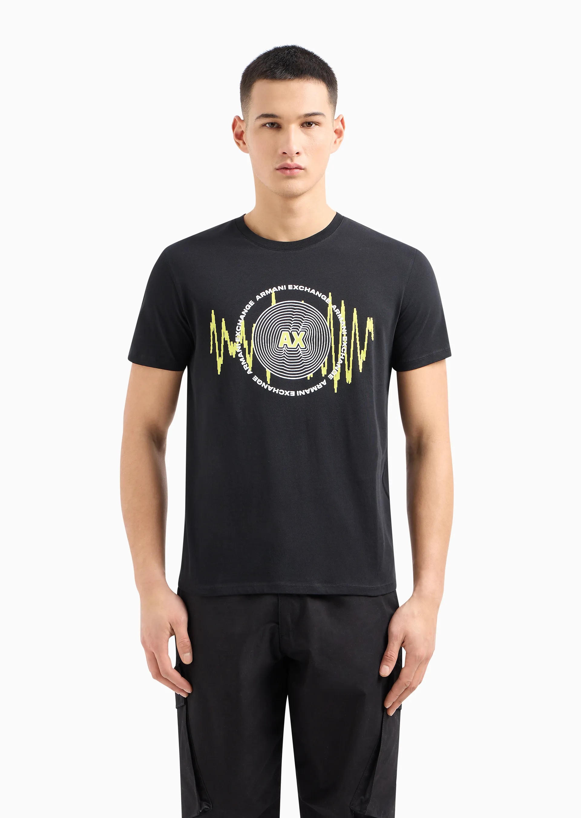 T-shirt realizzata in jersey di puro cotone ,stampa centrale in colore a contrasto. Il modello ha un fit regular,maniche corte e scollo tondo.