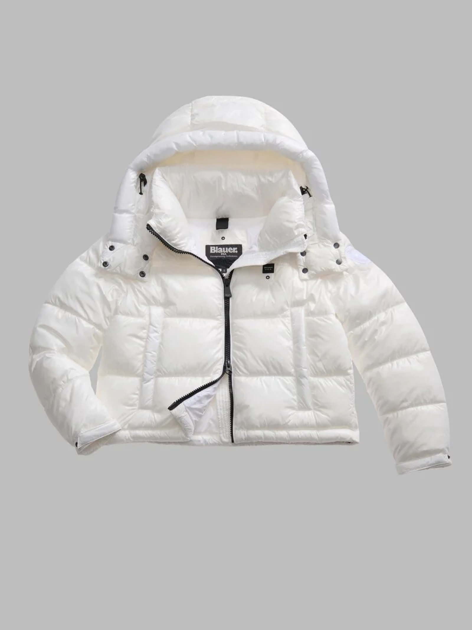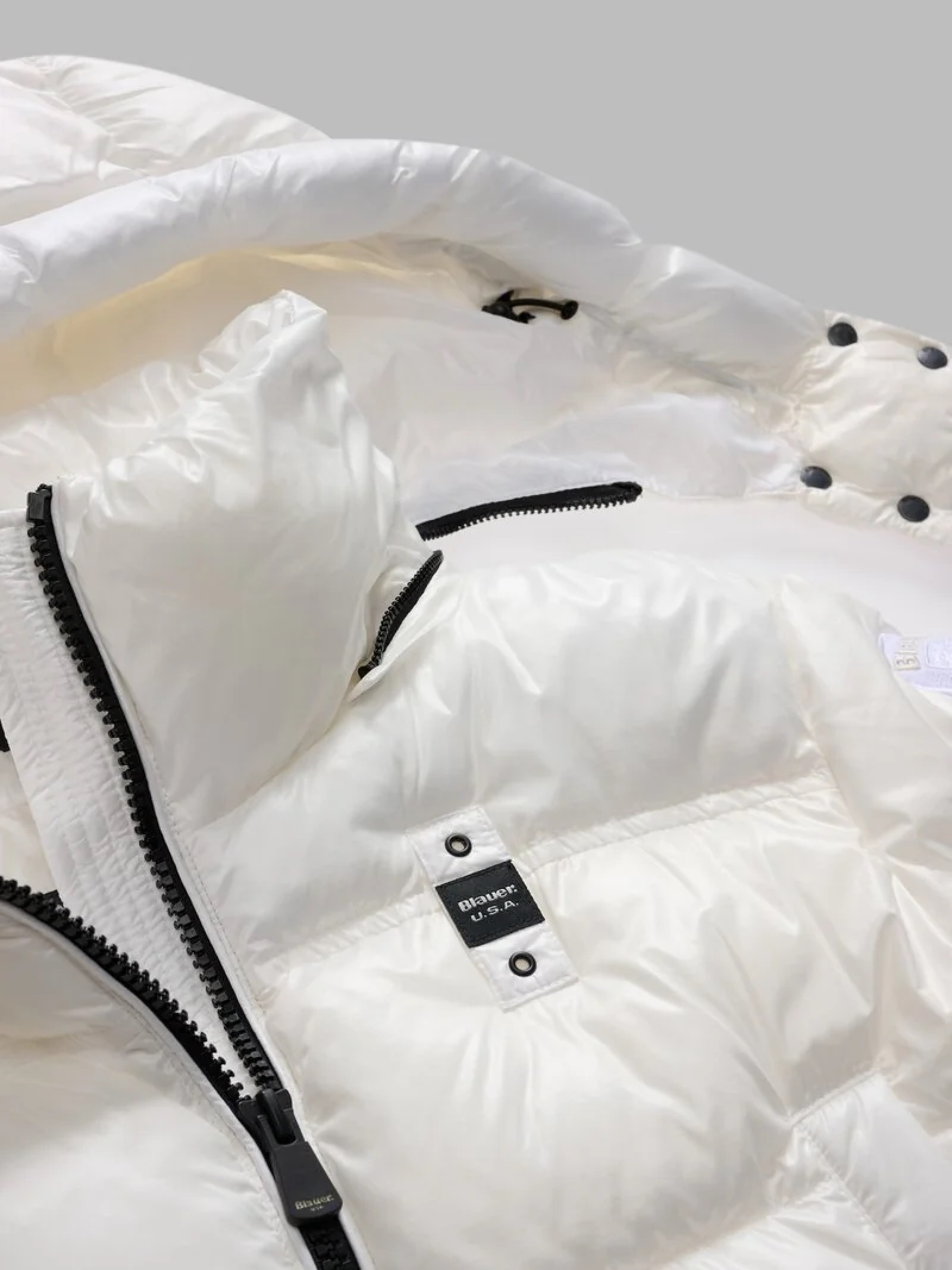 Giubbetto invernale Blauer in nylon micro rip idrorepellente con colletto alto e cappuccio removibile. Imbottito in ovatta sostenibile Sorona® Aura con impuntura a righe orizzontali per calore e comfort. Fodera interna a contrasto, tasche con automatici e fondo regolabile. Dettagli funzionali e logo Blauer completano un capo versatile e moderno, ideale per affrontare linverno con stile ed eleganza.