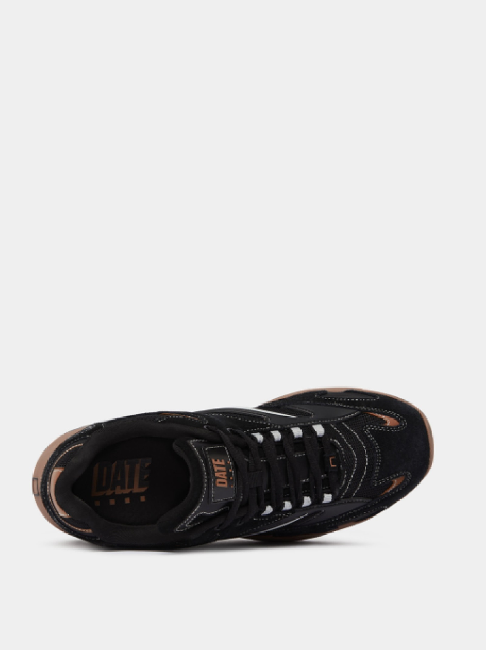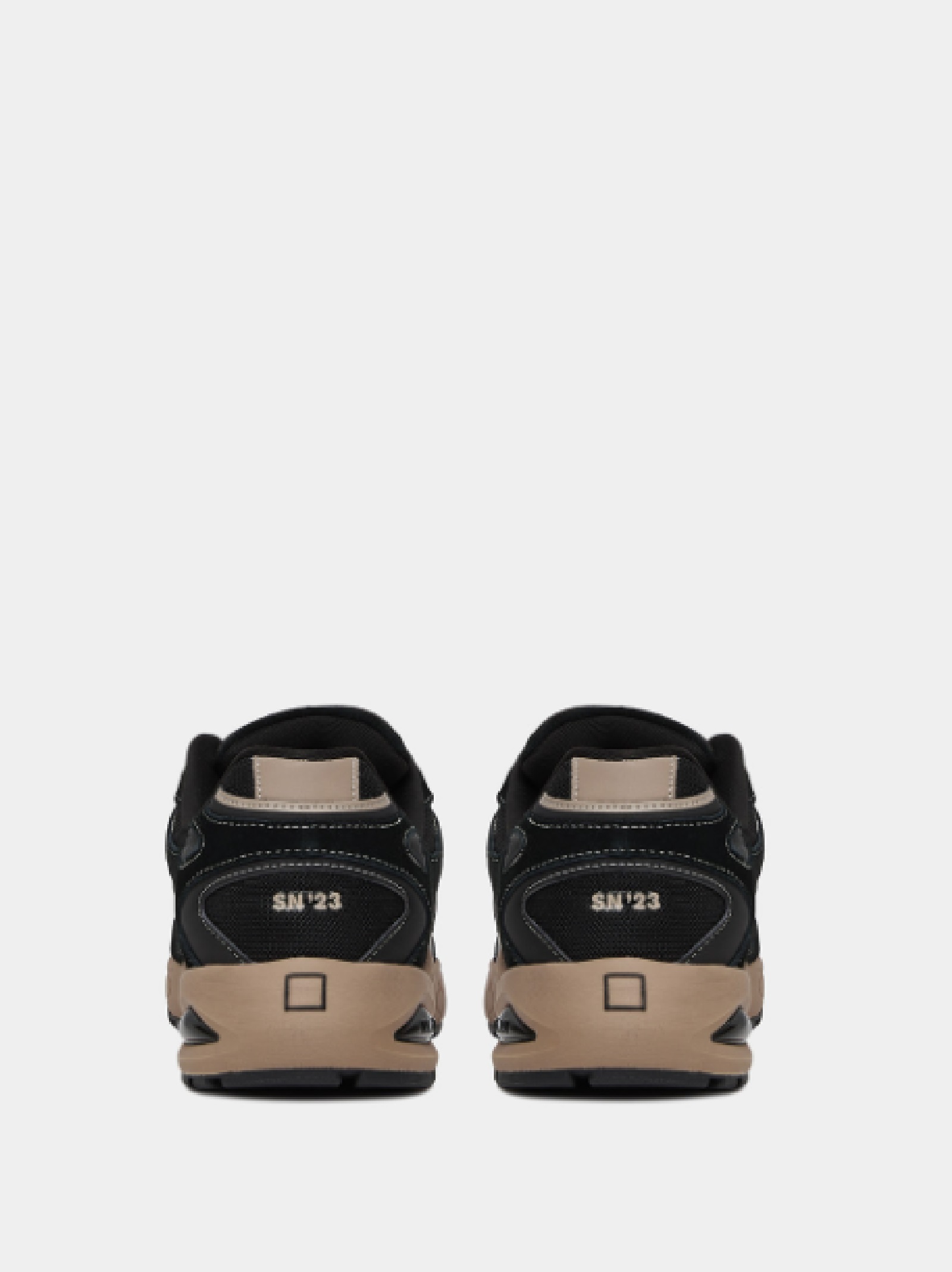 Running sneaker in tessuto tecnico nero con inserti in suede nero e inserti in TPU. Sulla linguetta in suede è applicata una label in TPU con la scritta D.A.T.E. I lacci sono in tessuto, e sul retro del modello è presente il nome SN'23 e il logo quadrato stampato in rilievo. La fodera è in tessuto e ci sono passalacci in tessuto. La suola in gomma è alta da 2 a 4 cm.