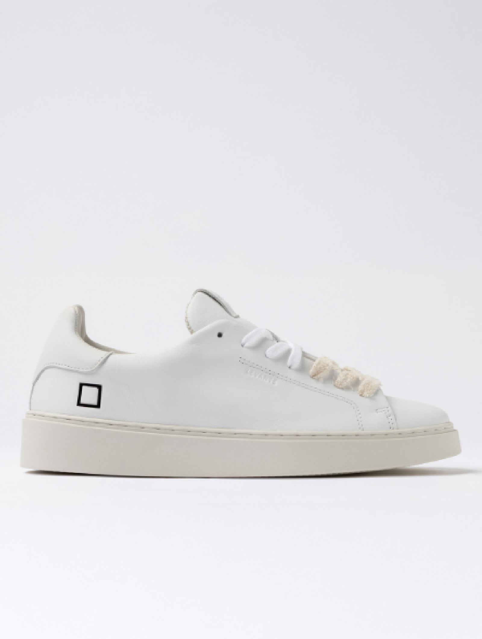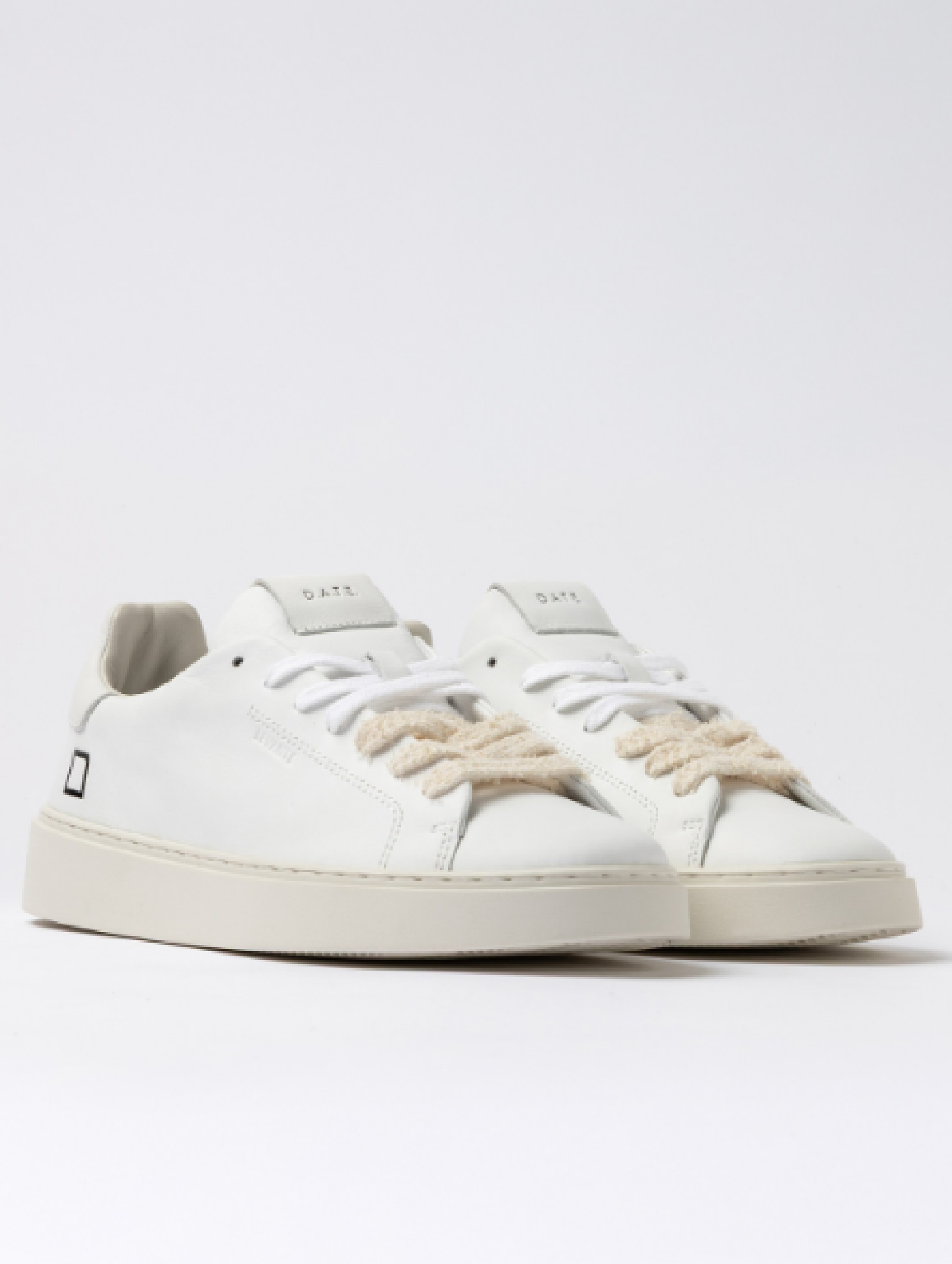 Sneakers basse D.A.T.E. da uomo in pelle bianca, realizzate con materiali Made in Italy. Design essenziale con logo laterale e label su linguetta. Lacci in cotone e effetto used per un tocco distintivo. Fodera in pelle e spugna di cotone, suola in gomma cucita. Soletto interno rialzato di 2,5 cm per massimo comfort. Vestibilità regular.