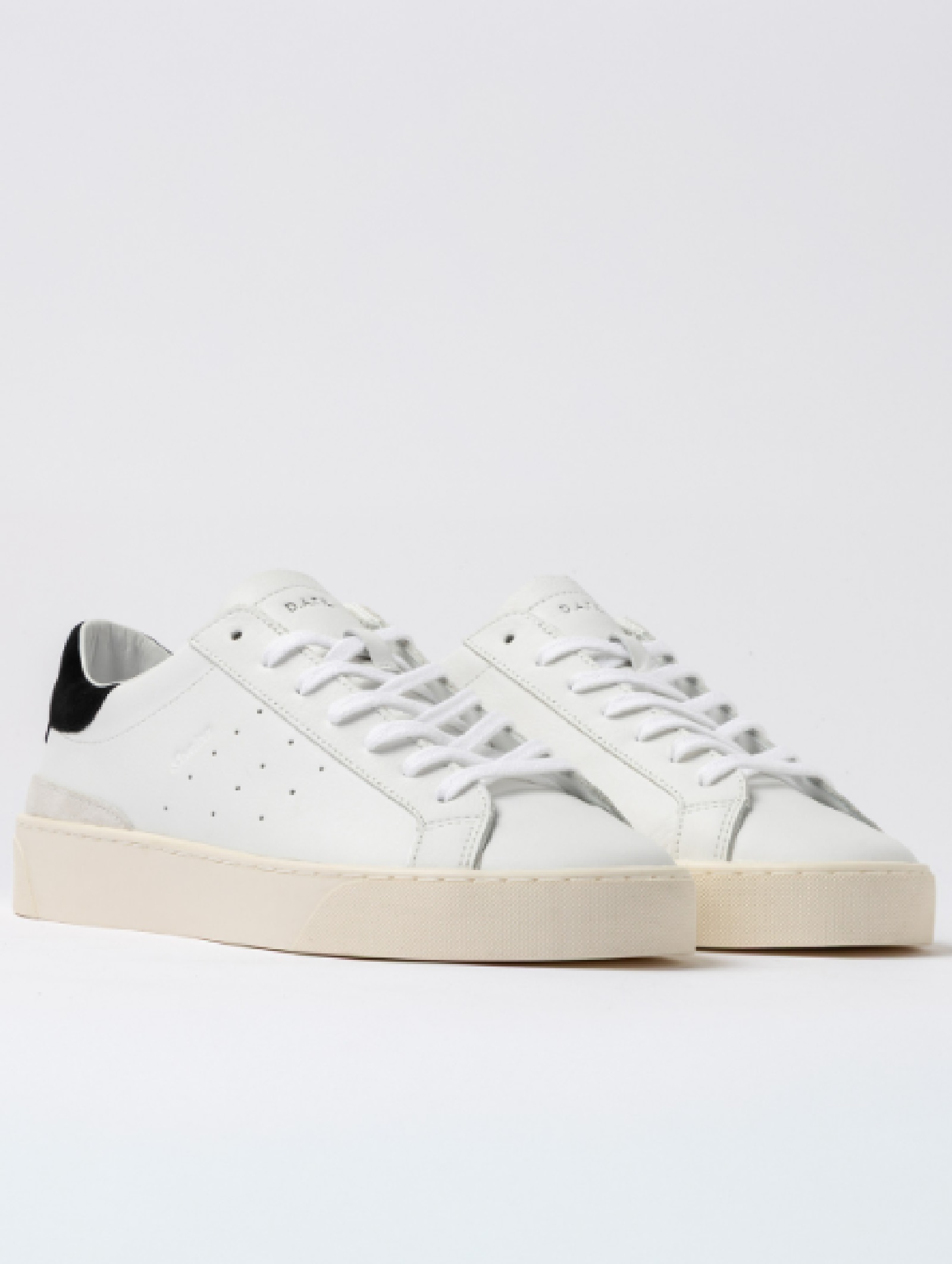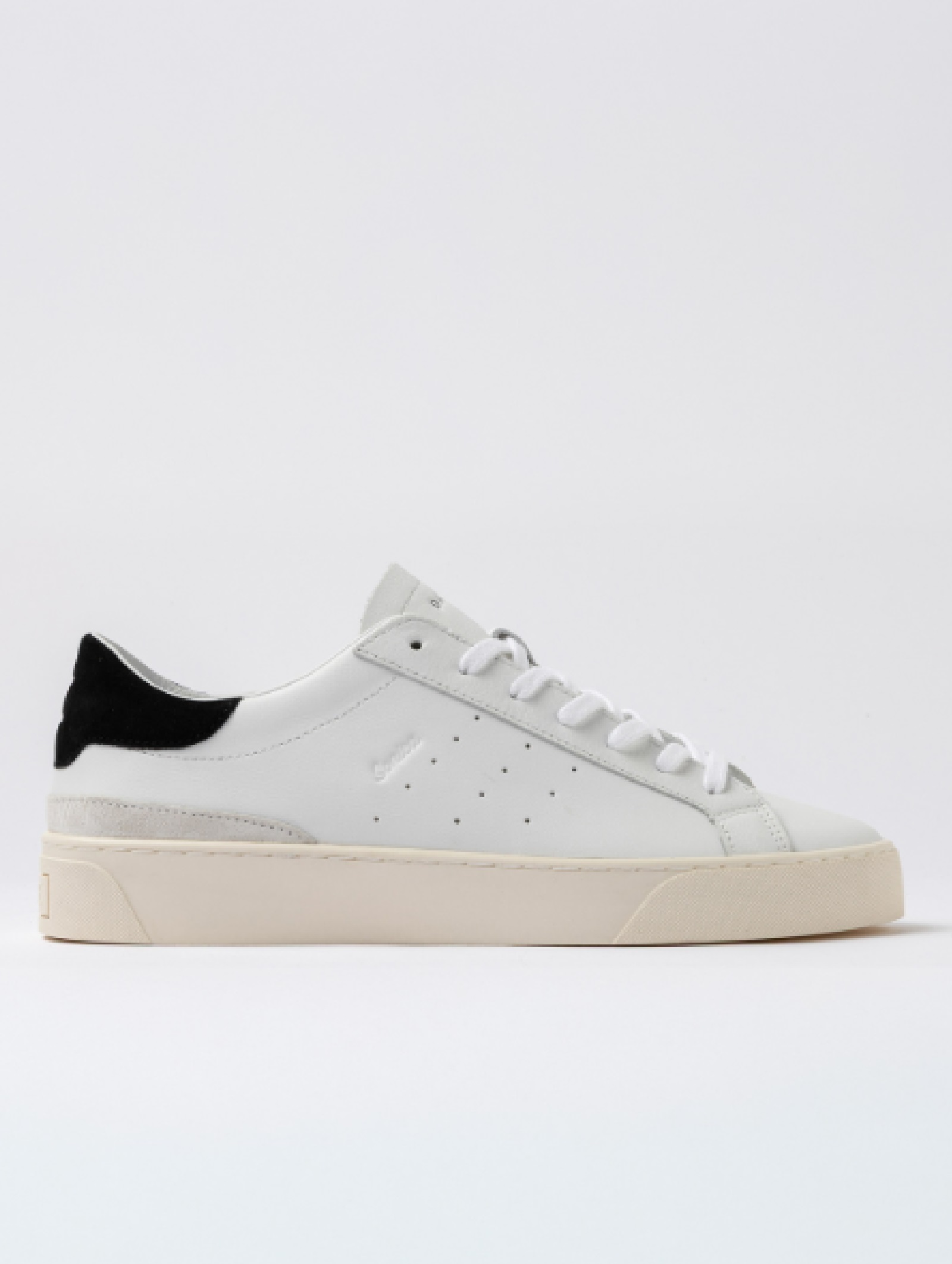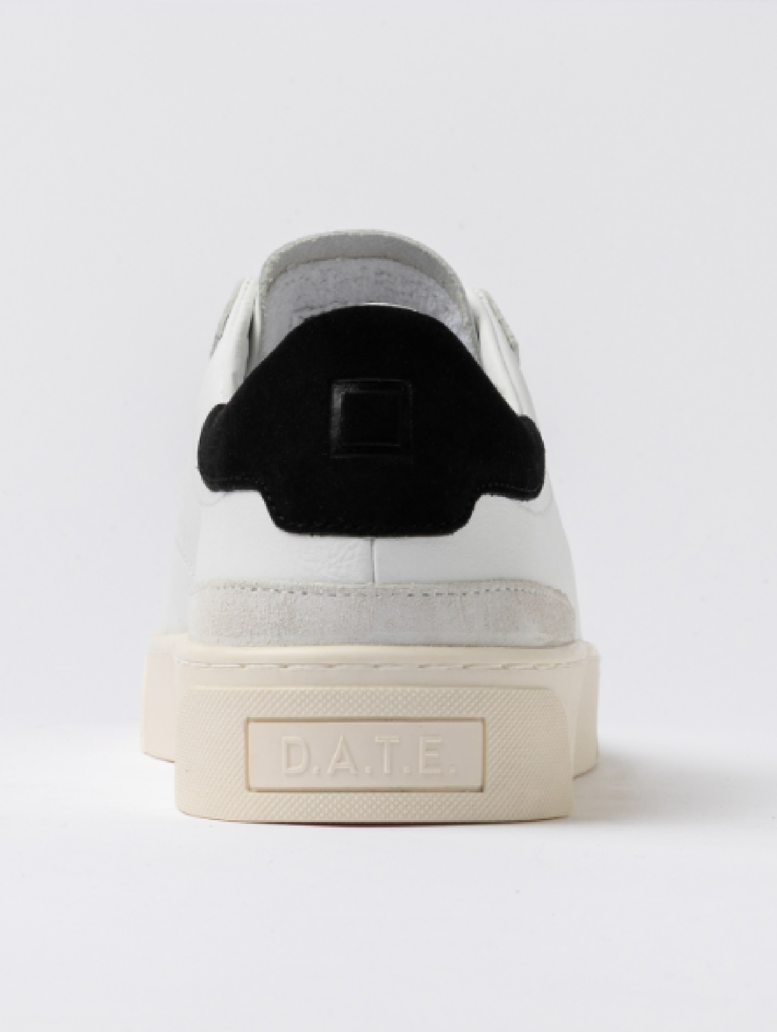 Sneakers D.A.T.E. da uomo in pelle bianca con talloncino in suede nero, realizzate con materiali Made in Italy. Design essenziale con logo laterale e linguetta logata. Fodera in pelle e spugna di cotone per comfort ottimale. Suola in gomma cucita alta 3 cm e soletta interna rialzata di 2,5 cm. Vestibilità regular.
