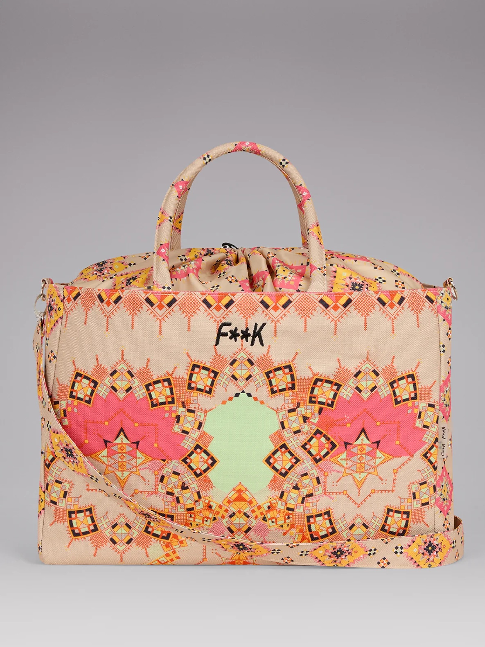 Borsa mare a fantasia con tracolla removibile e chiusura interna con coulisse, 100% Poliestere.