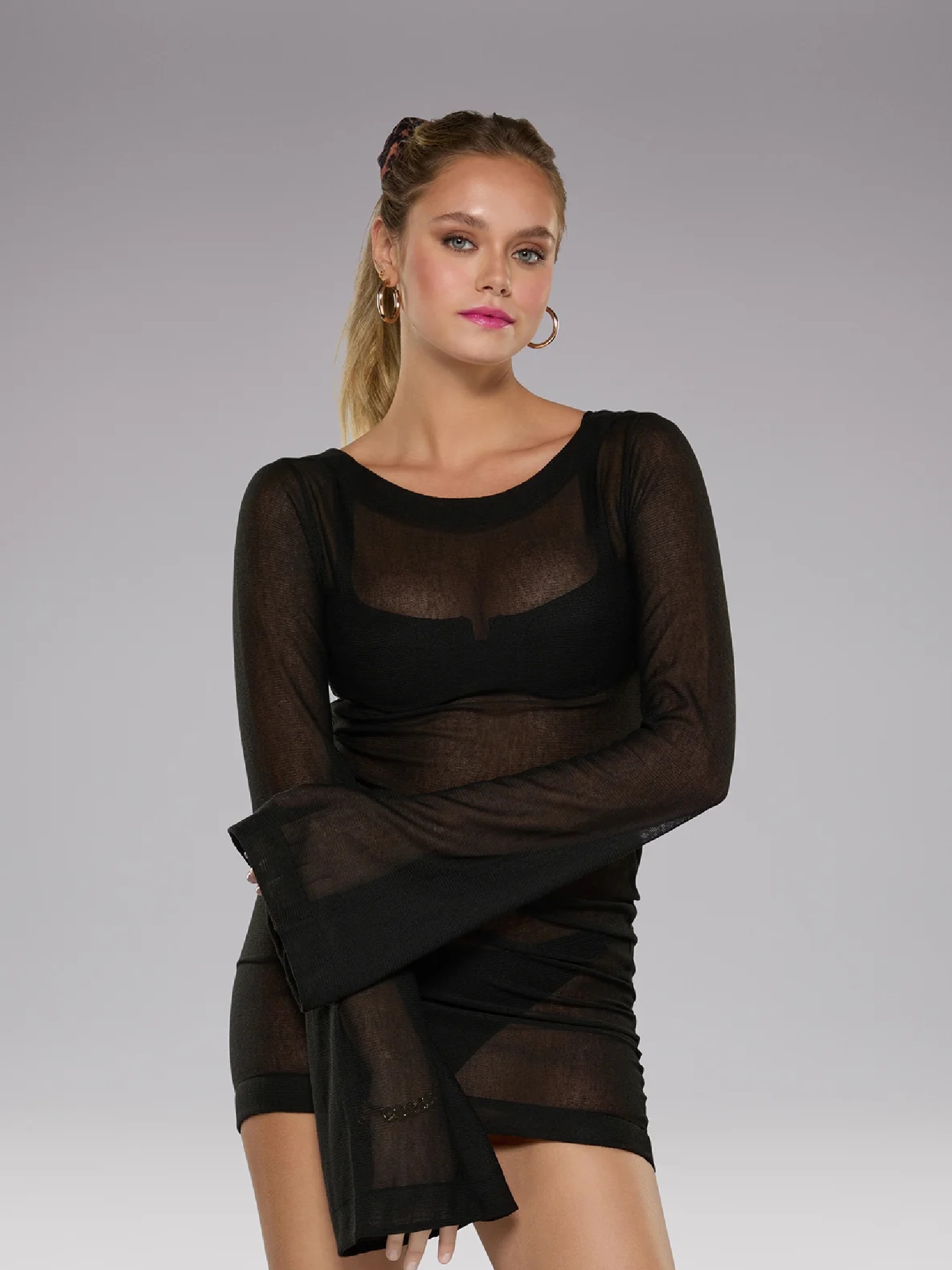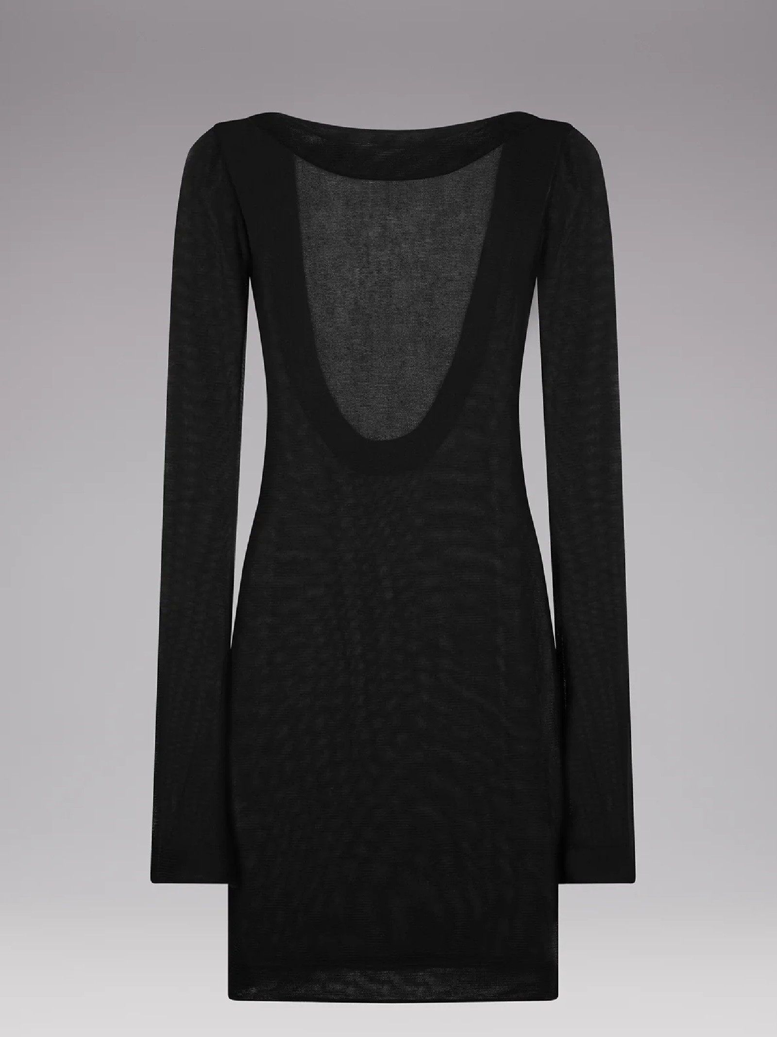 Minidress a manica lunga trasparente in tessuto maglieria nero con scollo sul retro.