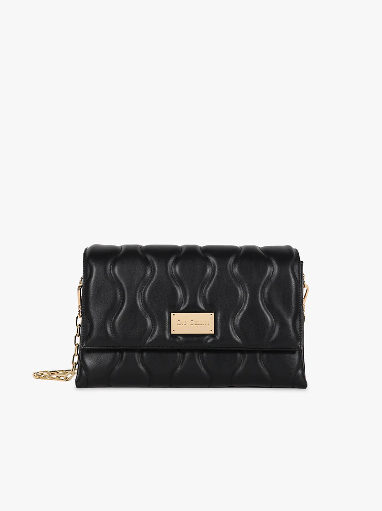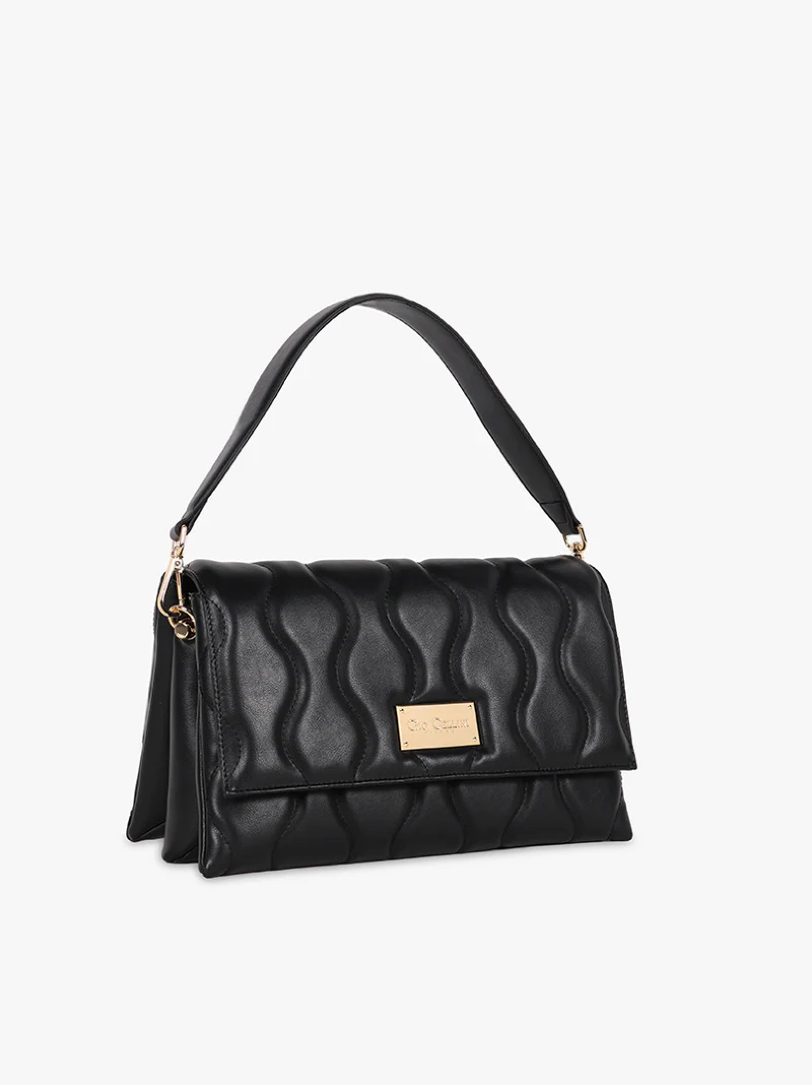 Borsa a tre scomparti in ecopelle liscia con lavorazione a effetto trapuntato, chiusura con automatico, manico singolo e tracolla a catena con spalla in ecopelle. Presenta uno scomparto interno con zip, logo placca con finitura dorata e fodera al 100% in poliestere.