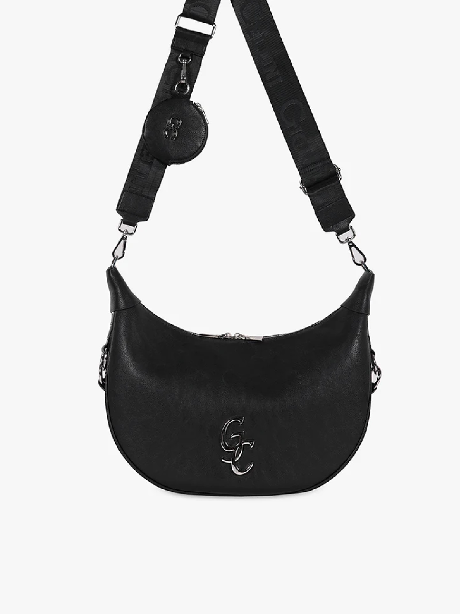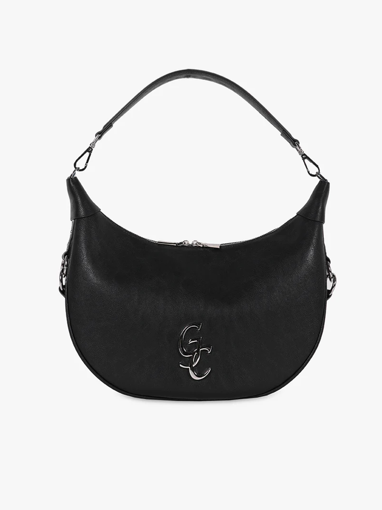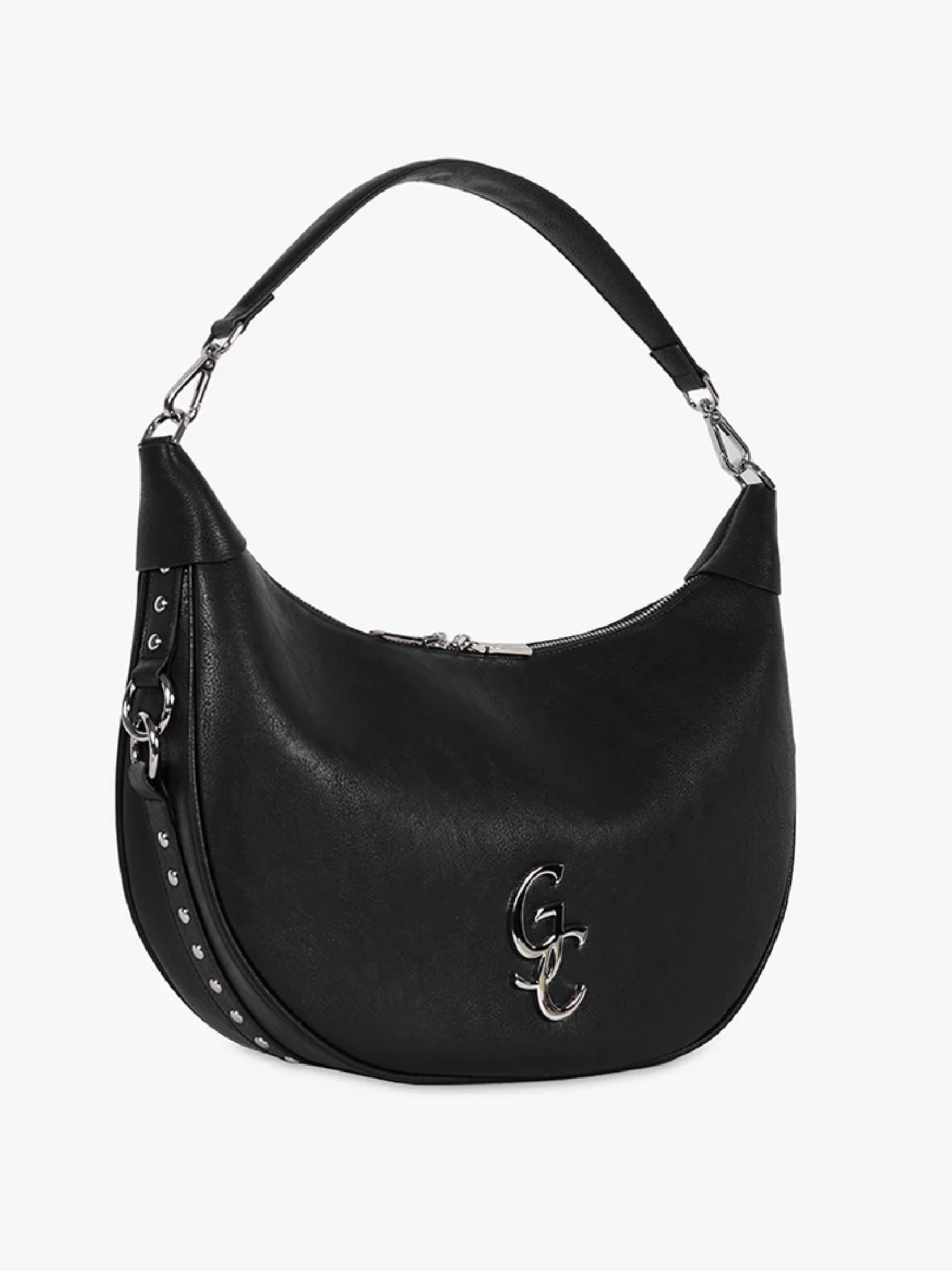 Borsa hobo in ecopelle con borchie decorative. Dotata di manico singolo e tracolla in nylon con accessorio. Chiusura con zip e tre tasche interne, di cui una con chiusura zip. Il logo monogram presenta una finitura argentata, e la fodera è realizzata al 100% in poliestere.