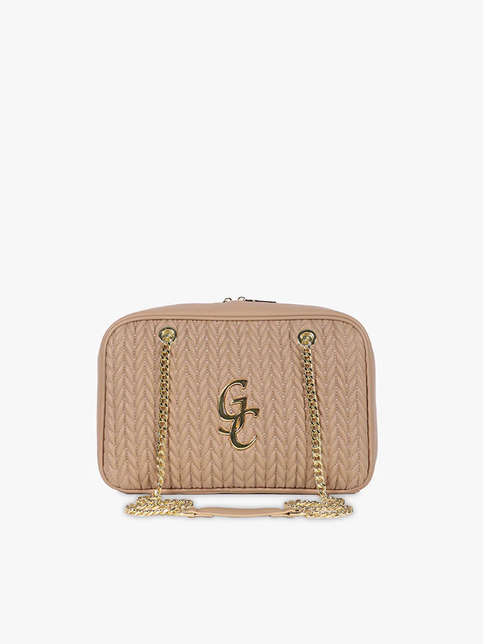 Borsa in ecopelle con lavorazione intrecciata, chiusura con zip, doppia tracolla a catena con spalla in ecopelle, tre tasche interne (di cui una con chiusura a zip), logo monogram con finitura dorata, e fodera al 100% in poliestere.
