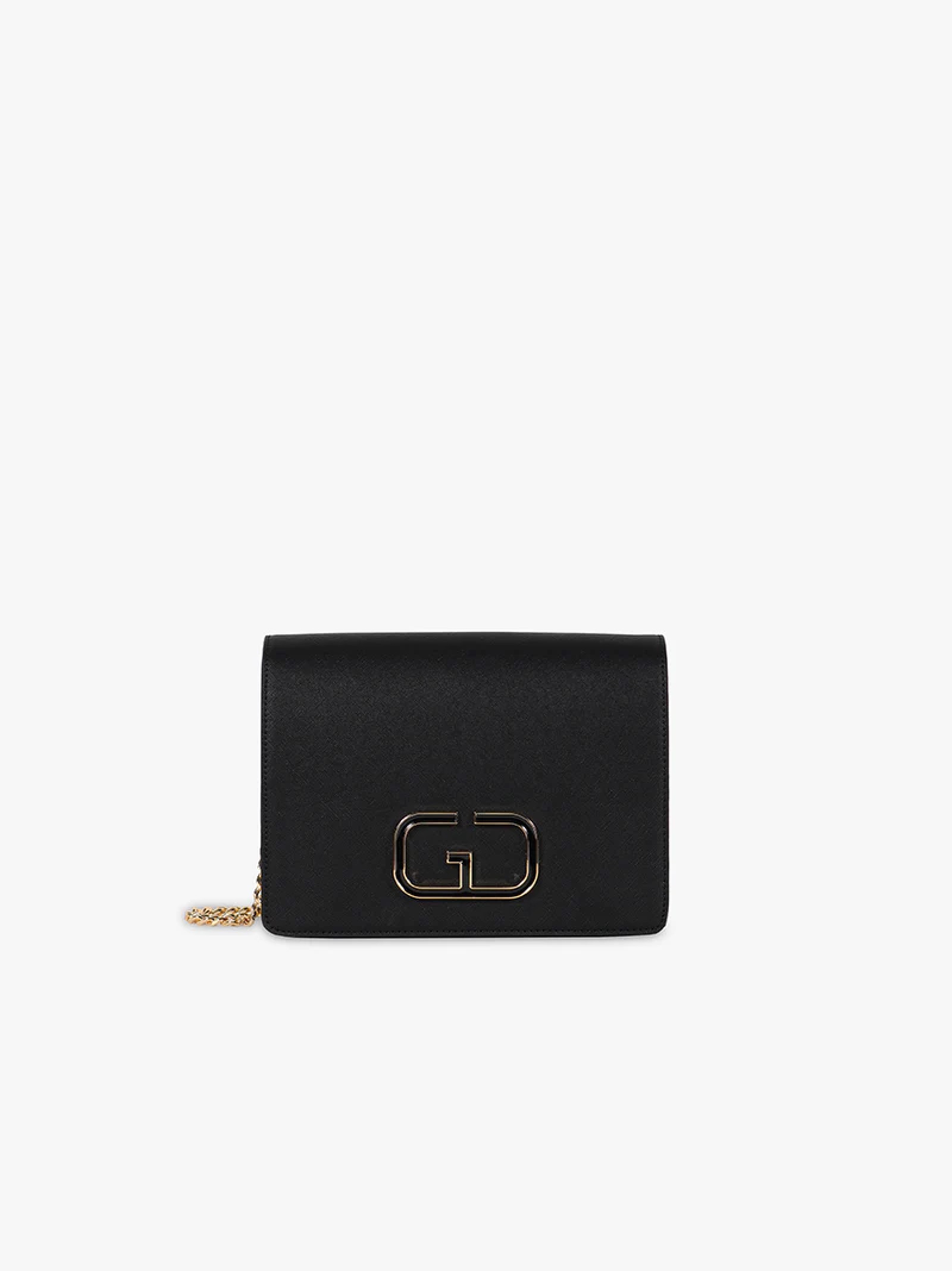 Borsa in saffiano con chiusura ad automatici, due tasche interne (una con chiusura a zip), tracolla a catena con spalla in ecopelle. Il logo smaltato è in tono su tono, e la fodera è realizzata al 100% in poliestere.