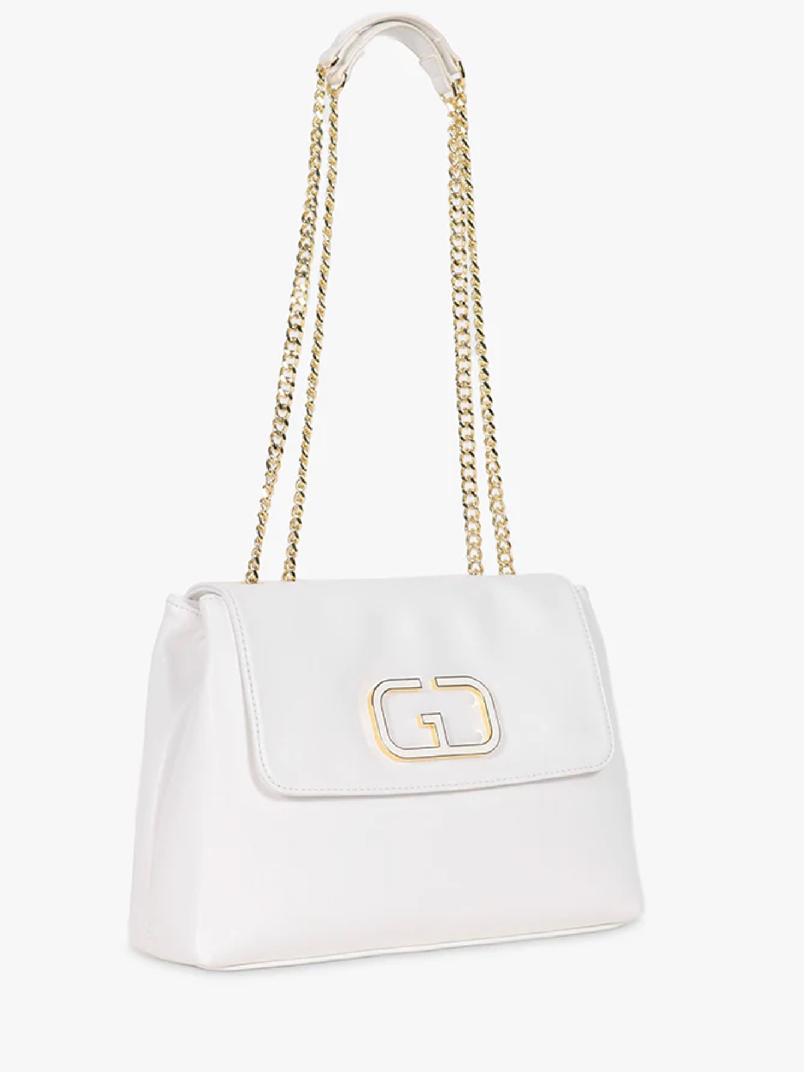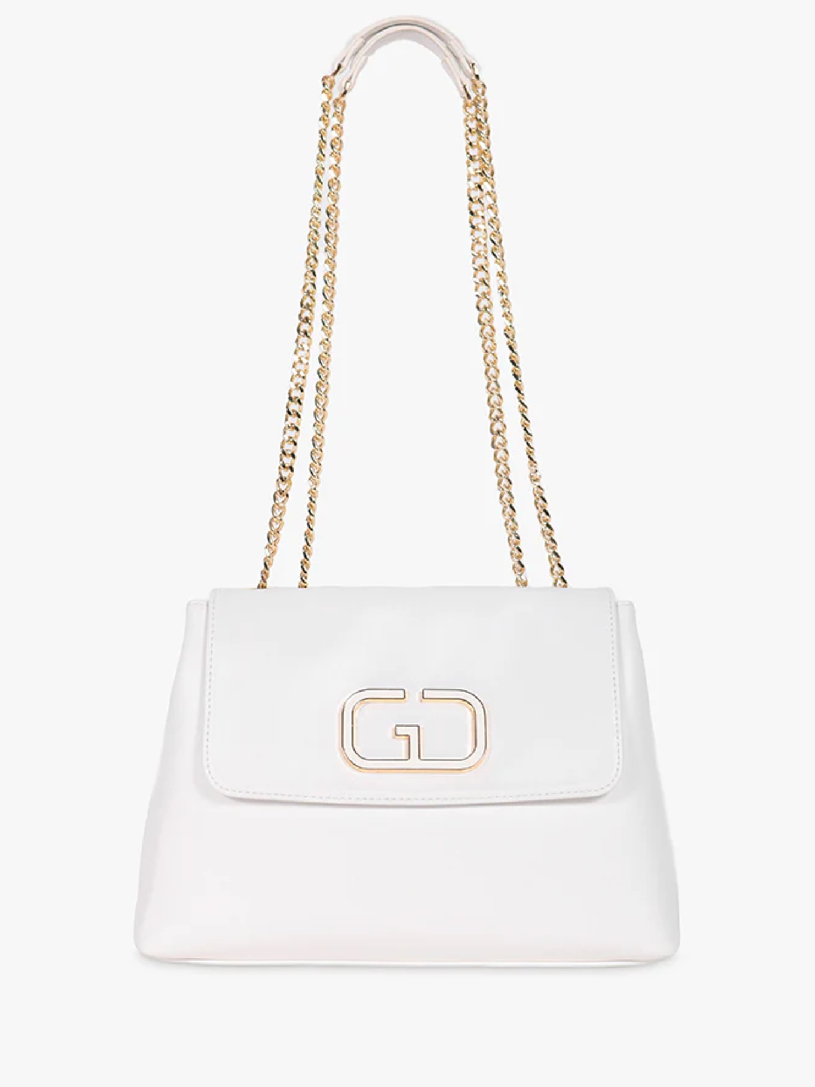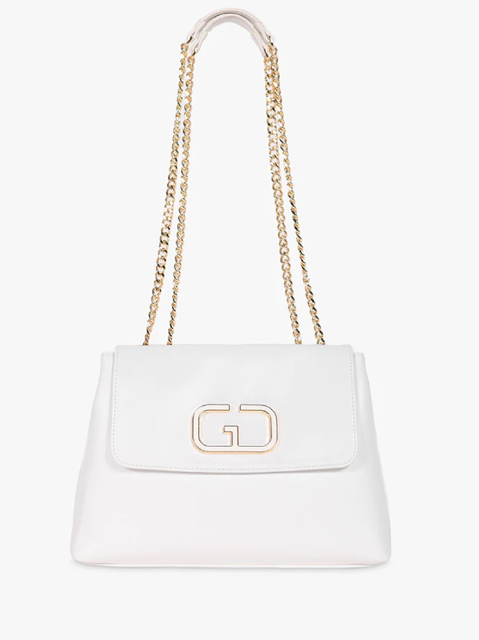 Borsa in ecopelle liscia con chiusura automatica, doppio manico a catena scorrevole con spalla in ecopelle. Scomparto interno con zip, tre tasche interne di cui una con chiusura zip e logo monogram finitura dorata.