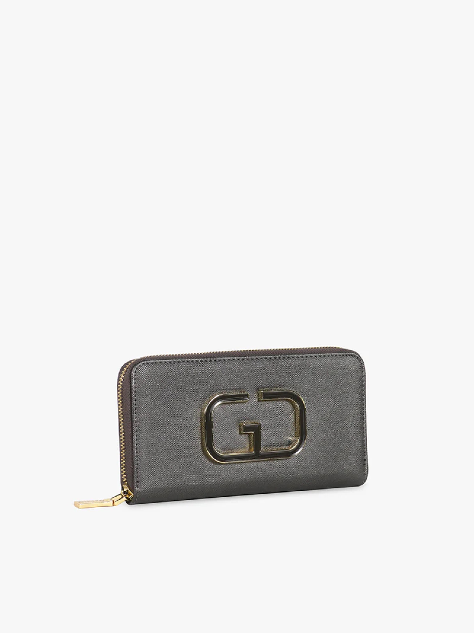 Portafoglio in saffiano con chiusura a zip su tre lati, logo smaltato tono su tono e fodera al 100% in poliestere.