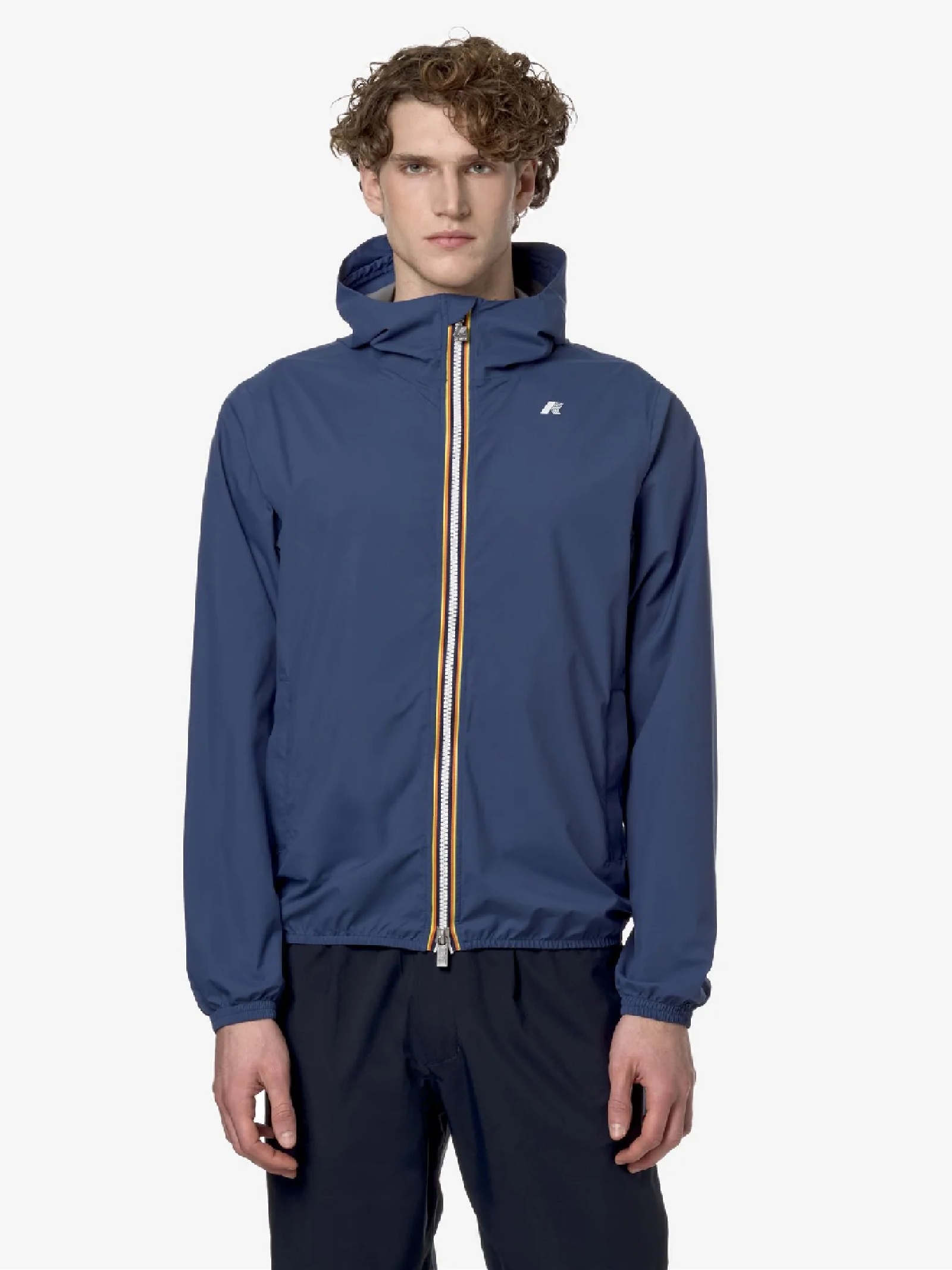 La giacca corta da uomo Jack è ideale per mezze stagioni, slim fit. Realizzata in tessuto tecnico elasticizzato e riciclato, resistente al vento e alla pioggia fino a 5000 colonne dacqua. Foderata internamente con membrana isolante, lettering K-Way argento stampato. Tasche laterali con zip, cappuccio avvolgente, polsini e bordi elastici per comfort e aderenza.