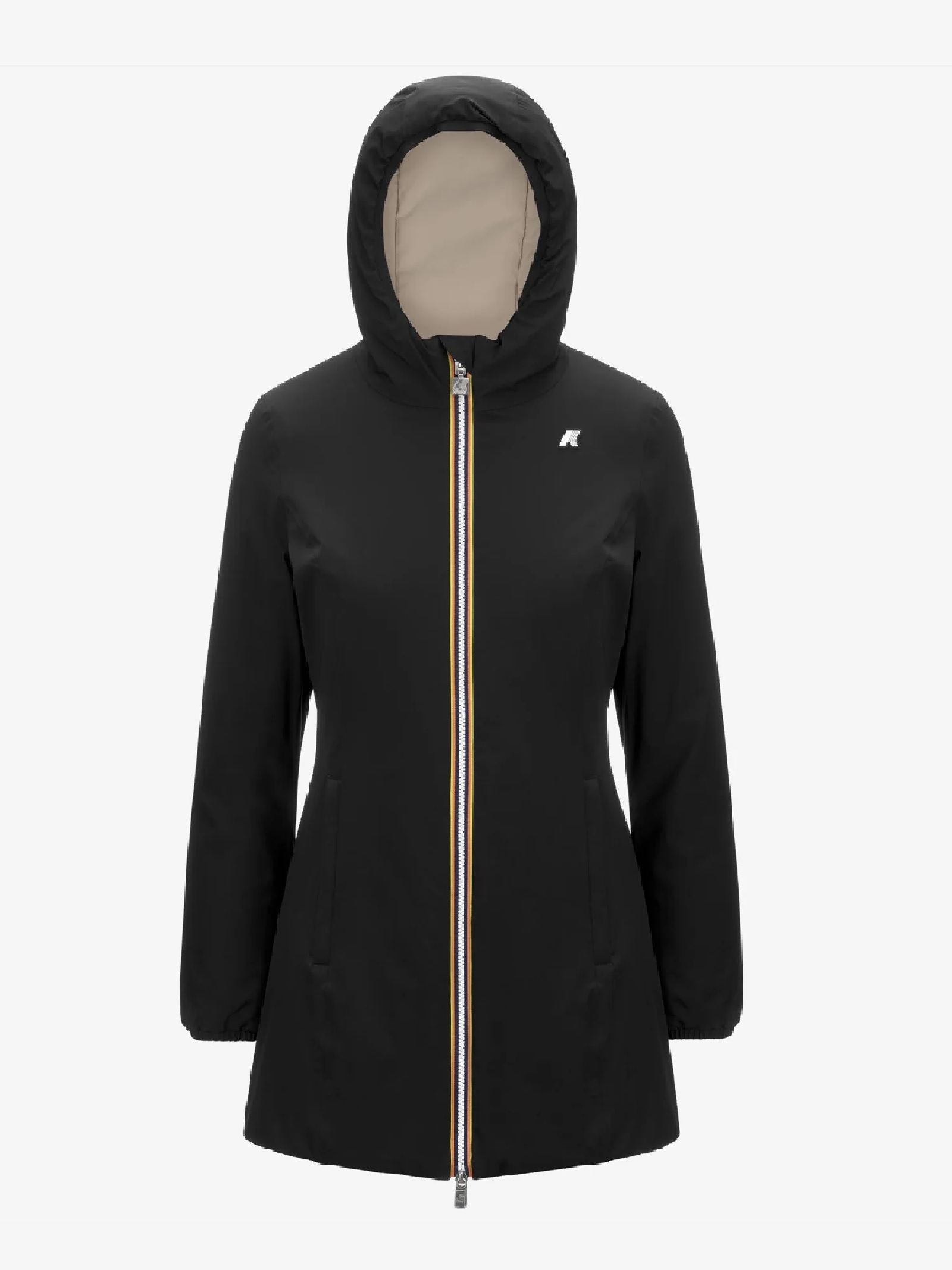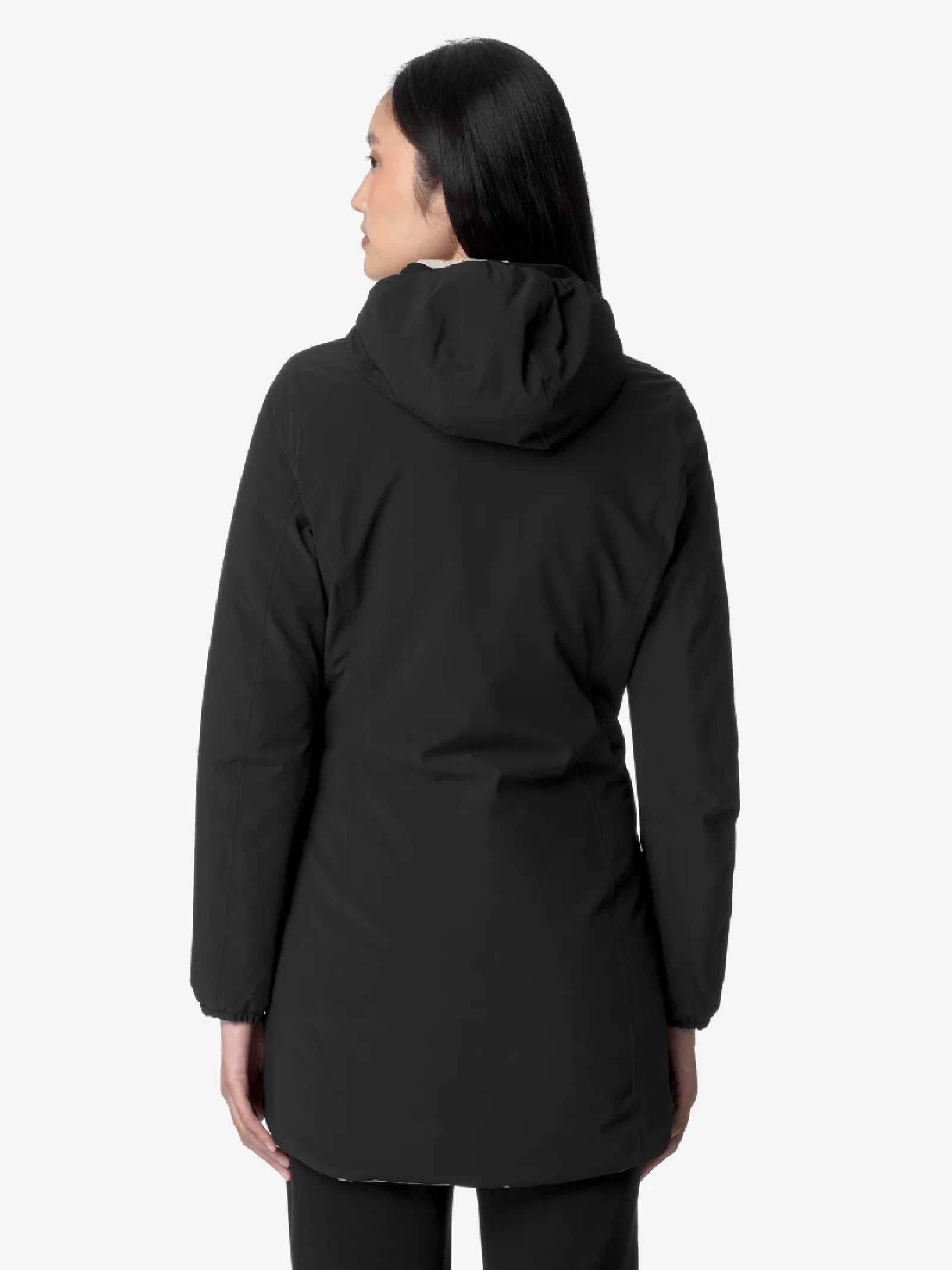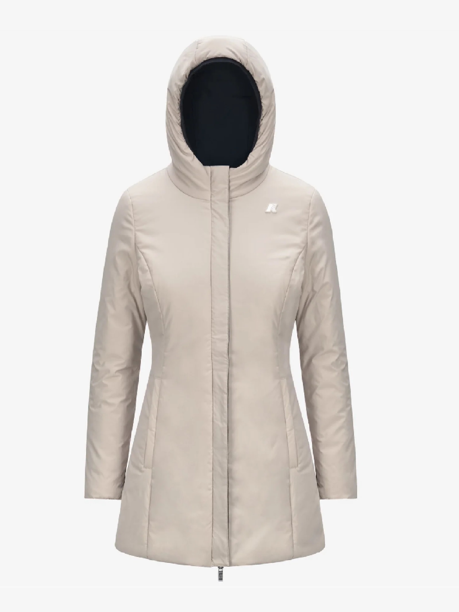 La giacca da donna Denise, con lunghezza a tre quarti, reinterpreta l'estetica funzionale di K-Way in una versione femminile e moderna. Il modello è reversibile, con un lato in poliestere elasticizzato impermeabile a tinta unita e l'altro in poliestere antivento a contrasto. L'imbottitura in ovatta fornisce un calore medio, perfetto per le mezze stagioni, mentre le cuciture termonastrate garantiscono protezione dal freddo e massimo comfort durante le attività all'aperto.