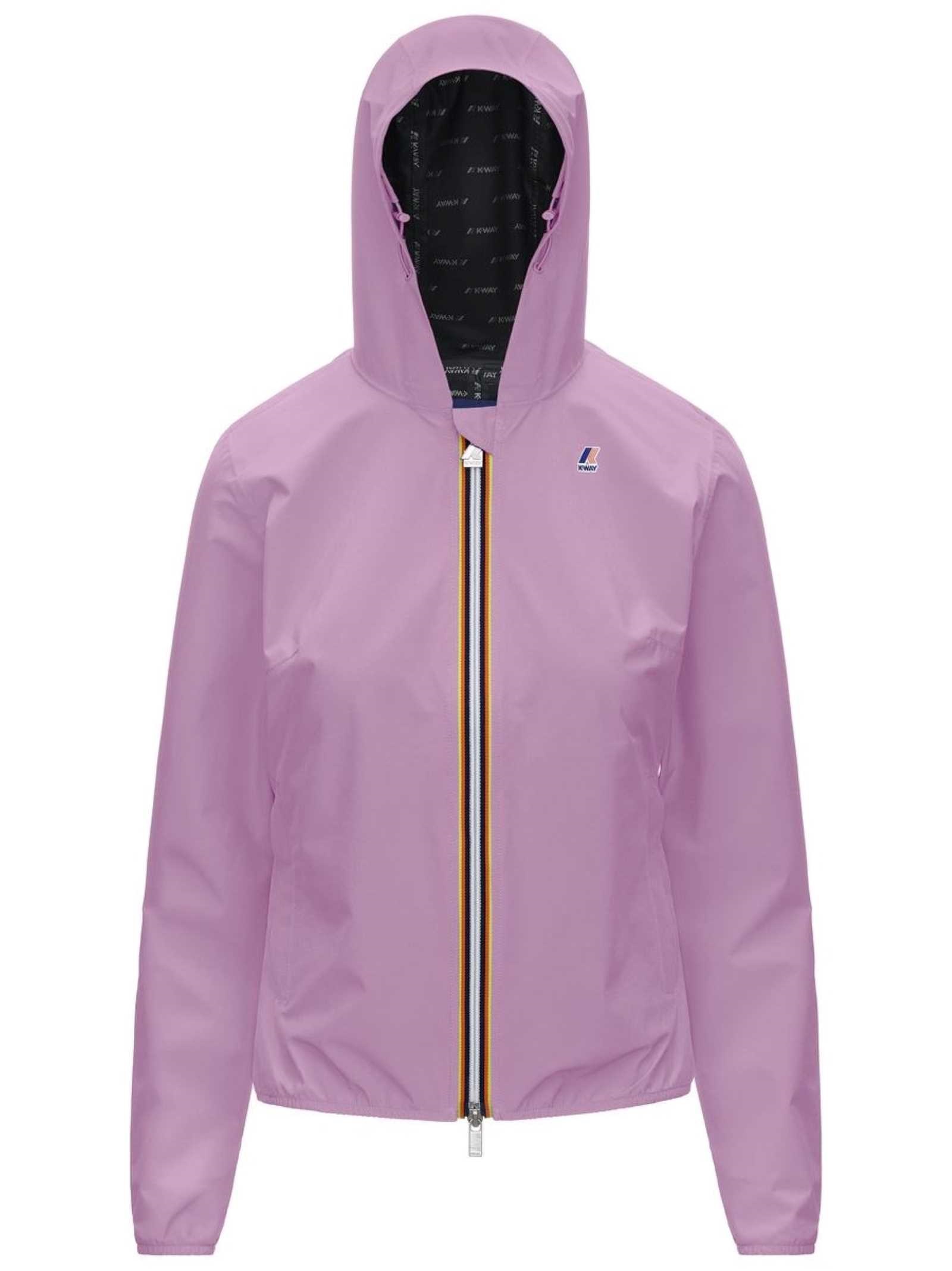 Giacca corta da donna con vestibilità slim realizzata in tessuto tecnico elasticizzato che protegge dall'acqua e dal vento. L'interno è foderato con una membrana isolante decorata con lettering K-Way stampato all over in tonalità argento. Le tasche laterali con zip, il cappuccio con coulisse e i polsini elastici sono dettagli funzionali che rendono il capo pratico e versatile durante l'attività all'aria aperta.