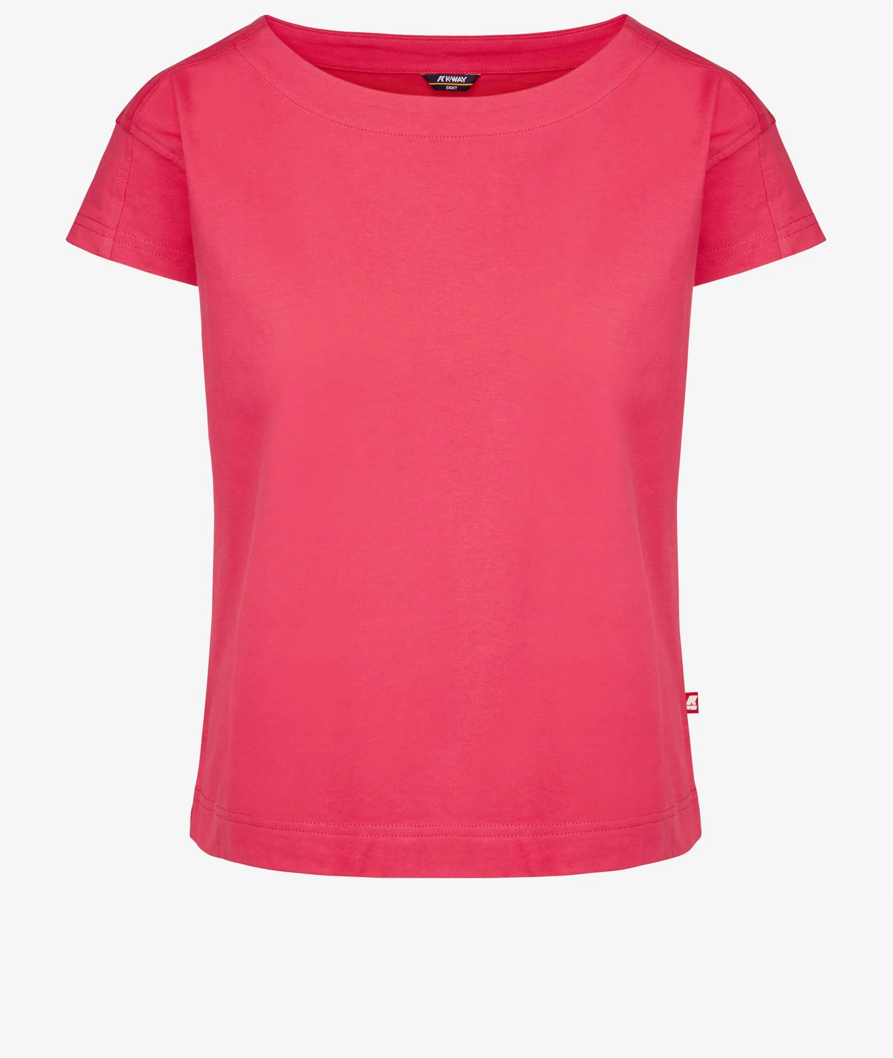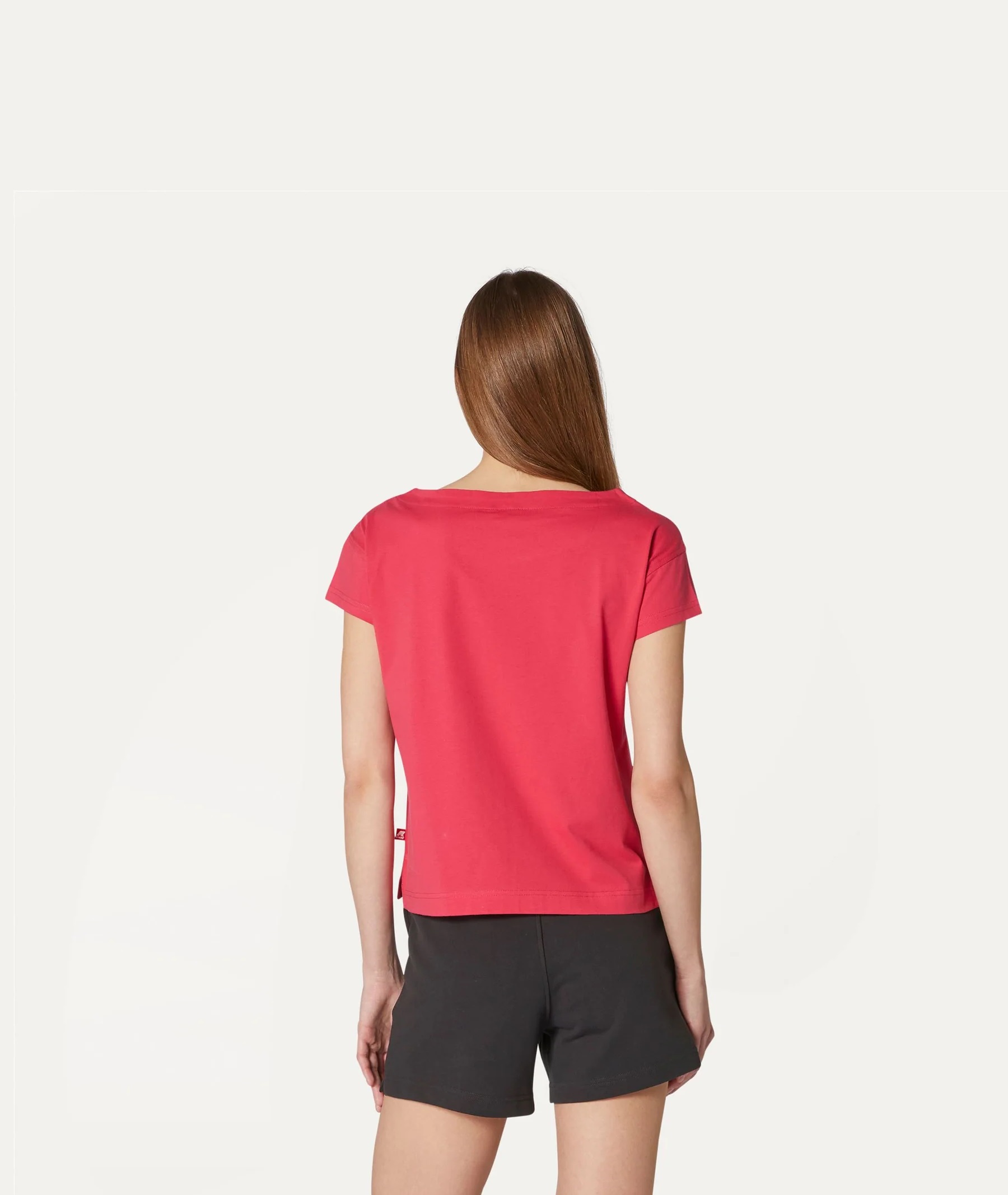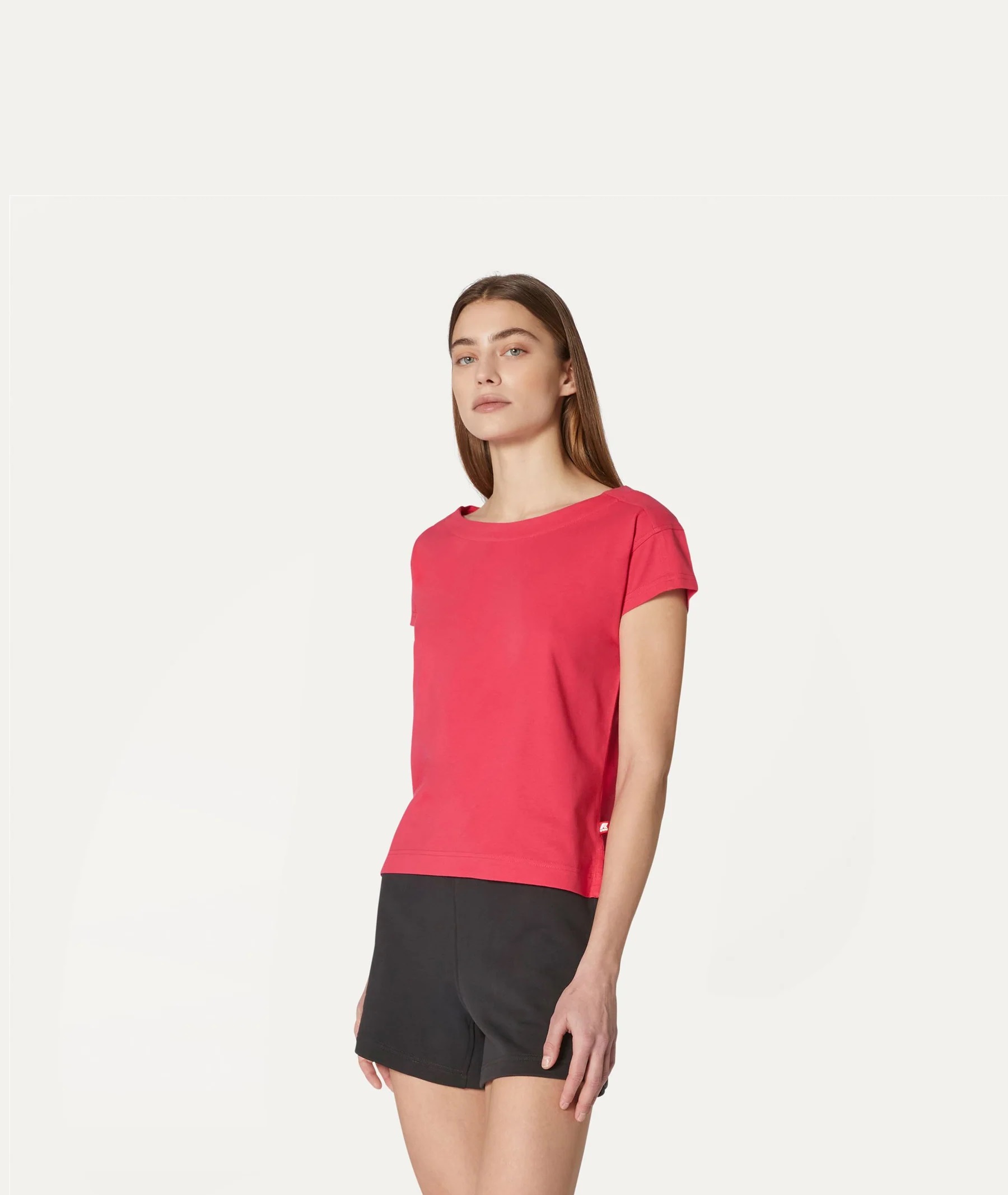 Rory è la t-shirt dalla linea femminile con collo a barchetta e maniche a kimono. Il modello è in jersey di cotone, traspirante.