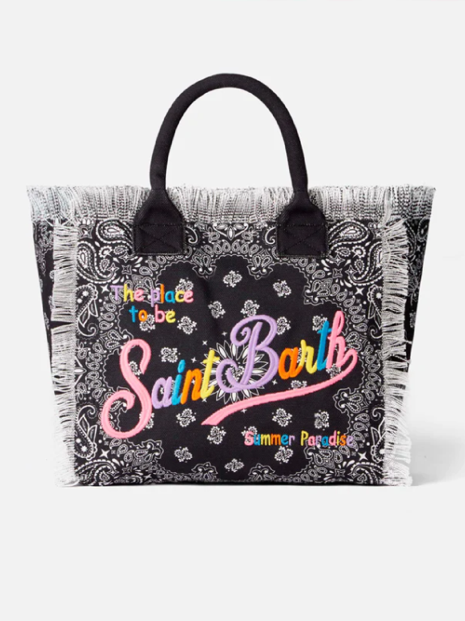 Borsa con motivo bandana bianco su sfondo nero e stampa logo multicolore. Dotata di tasca interna con cerniera. Dimensioni: 40 cm x 32 cm x 20 cm.
