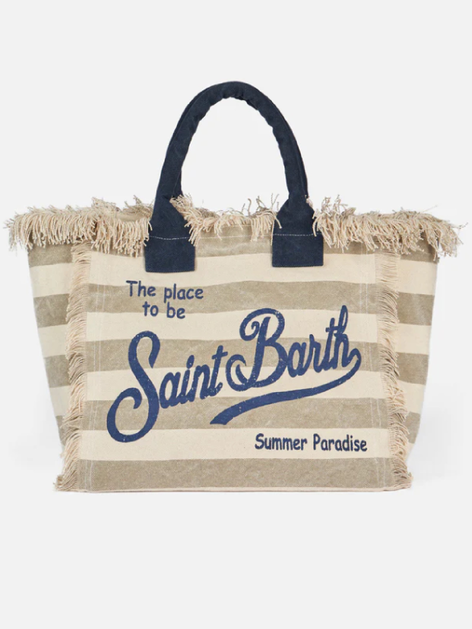Ti presentiamo Vanity, la nostra borsa tote chic realizzata in resistente tela di cotone. È una compagna versatile progettata per le giornate in spiaggia, le fughe estive e i momenti di relax. L'interno spazioso è perfetto per trasportare i tuoi oggetti essenziali, mentre la robusta tela di cotone garantisce resistenza. La borsa Vanity è decorata con una stampa a righe beige, aggiungendo un tocco di stile al tuo outfit. Il logo è stampato con firma Saint Barth. Dotata di patta interna e tasca interna, entrambe con cerniera. Dimensioni: 40 x 32 x 20 cm. Composizione: 100% cotone.
