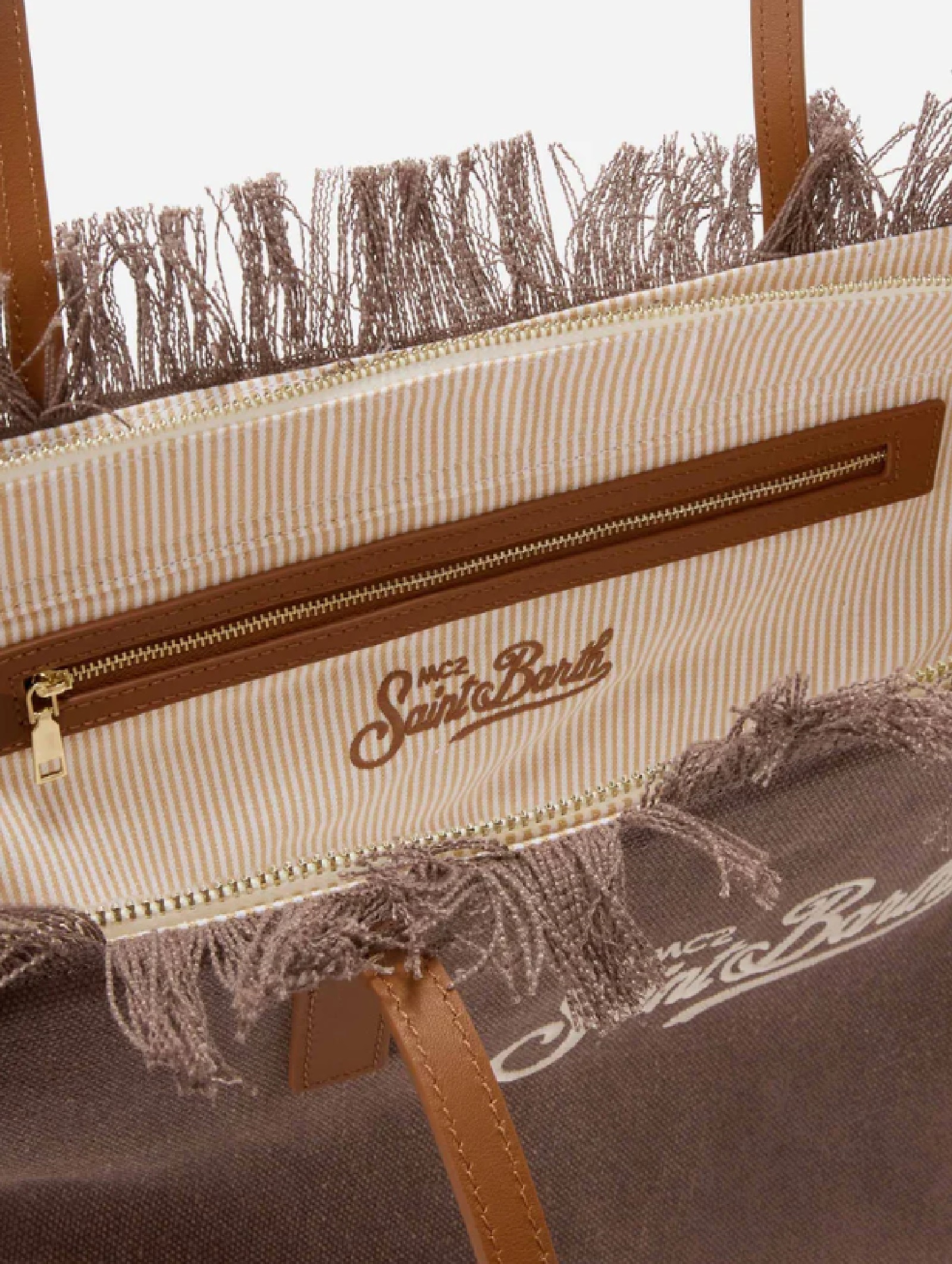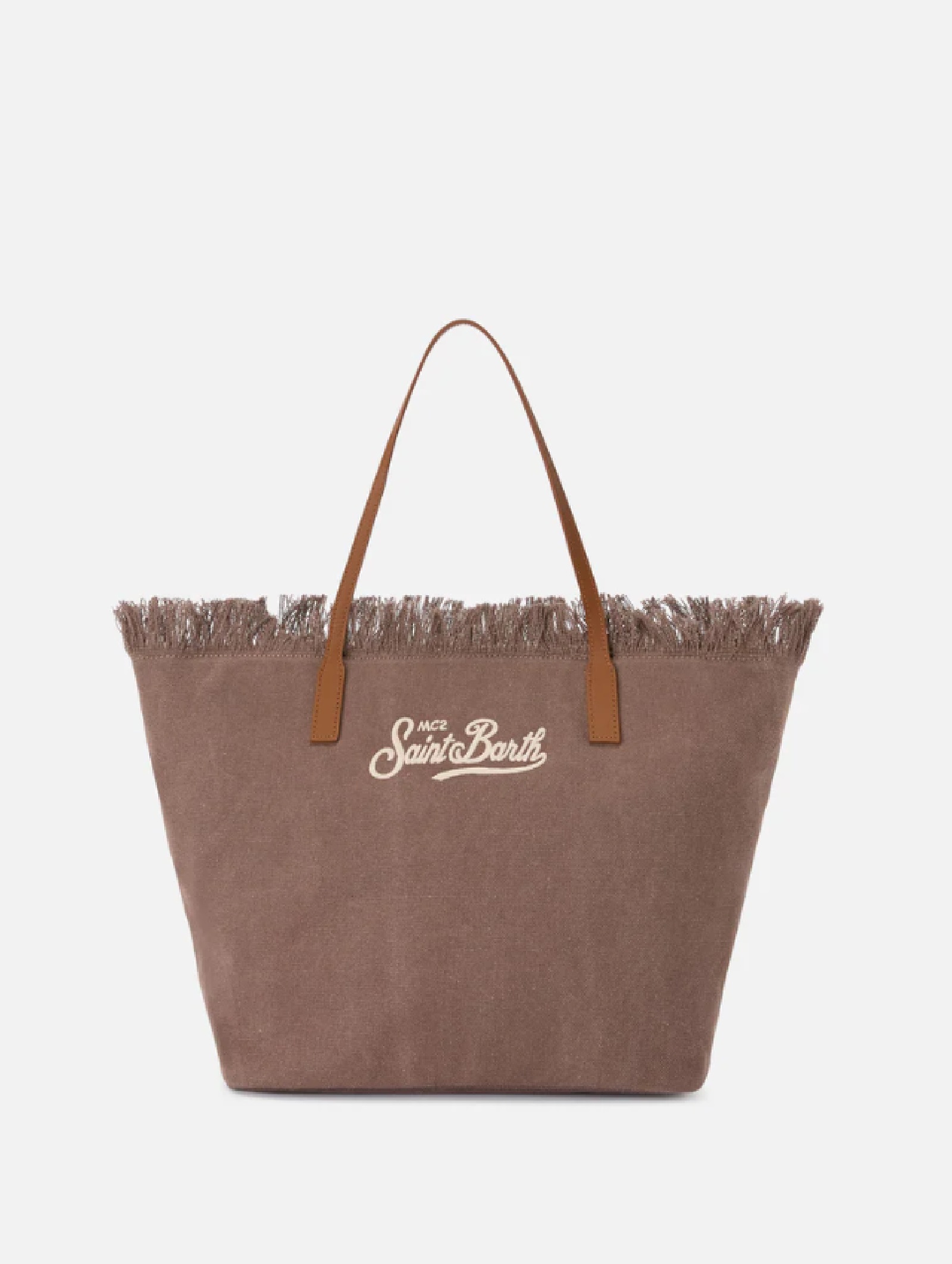 Borsa Shopper City Regular SAINT BARTH in tessuto canvas marrone, resistente e versatile. Design morbido con bordo sfrangiato e logo ricamato frontale. Capiente e funzionale, è dotata di doppi manici, chiusura con zip e tasca interna portaoggetti. Perfetta per luso quotidiano con uno stile pratico e contemporaneo.