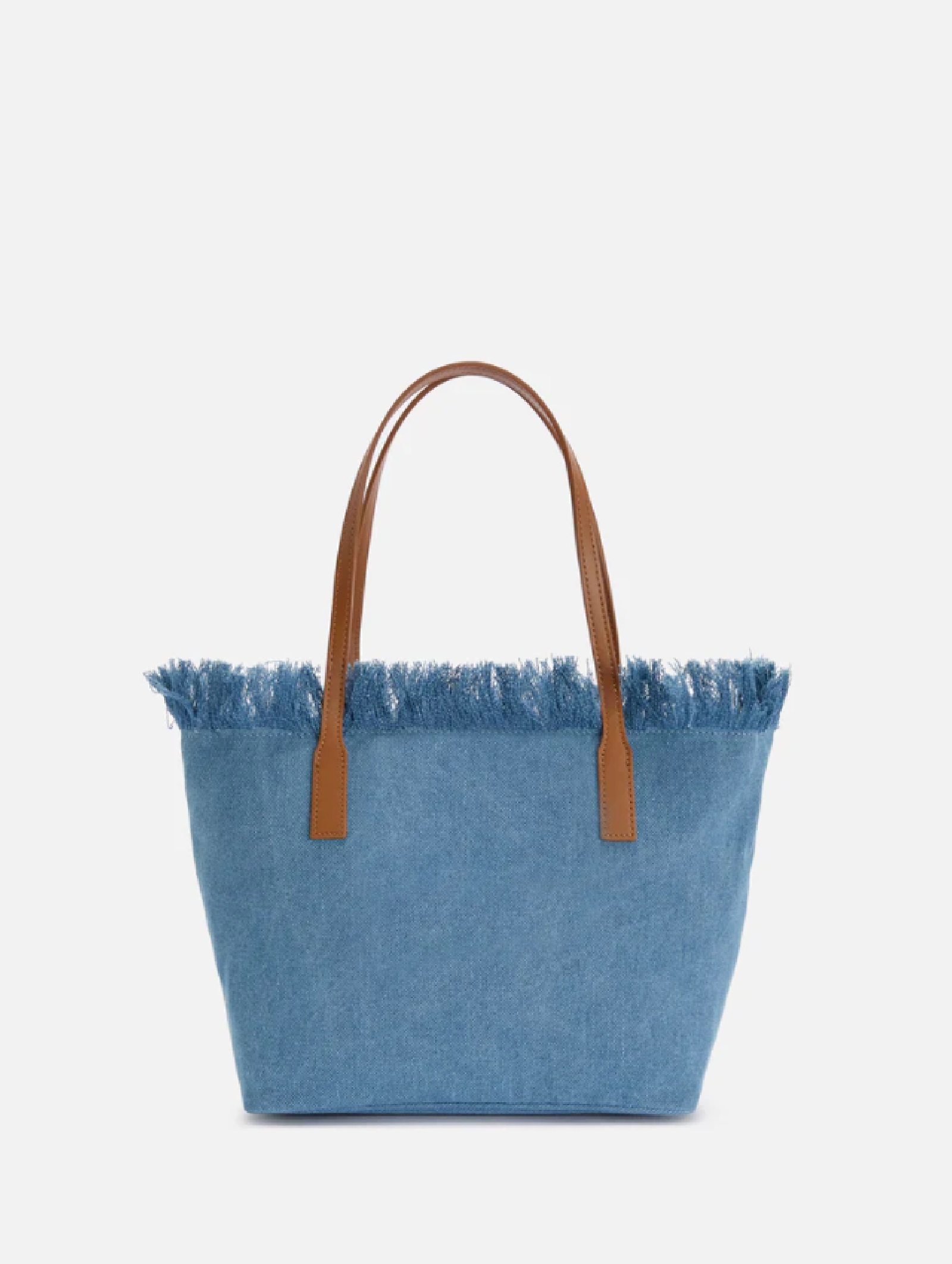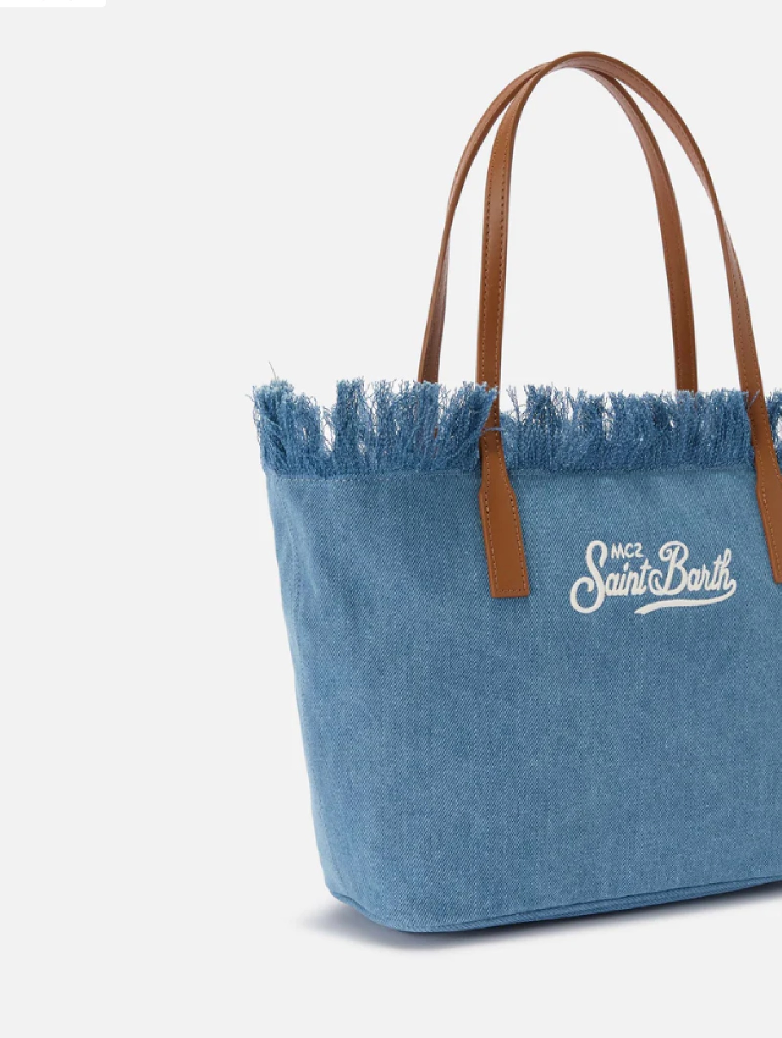Borsa Shopper Medium City SAINT BARTH in tessuto effetto denim blu scuro, morbida e capiente. Design casual con bordo sfrangiato e logo ricamato frontale. Dotata di doppi manici, chiusura con zip e tasca interna portaoggetti. Perfetta per uso quotidiano, unisce praticità e stile contemporaneo.