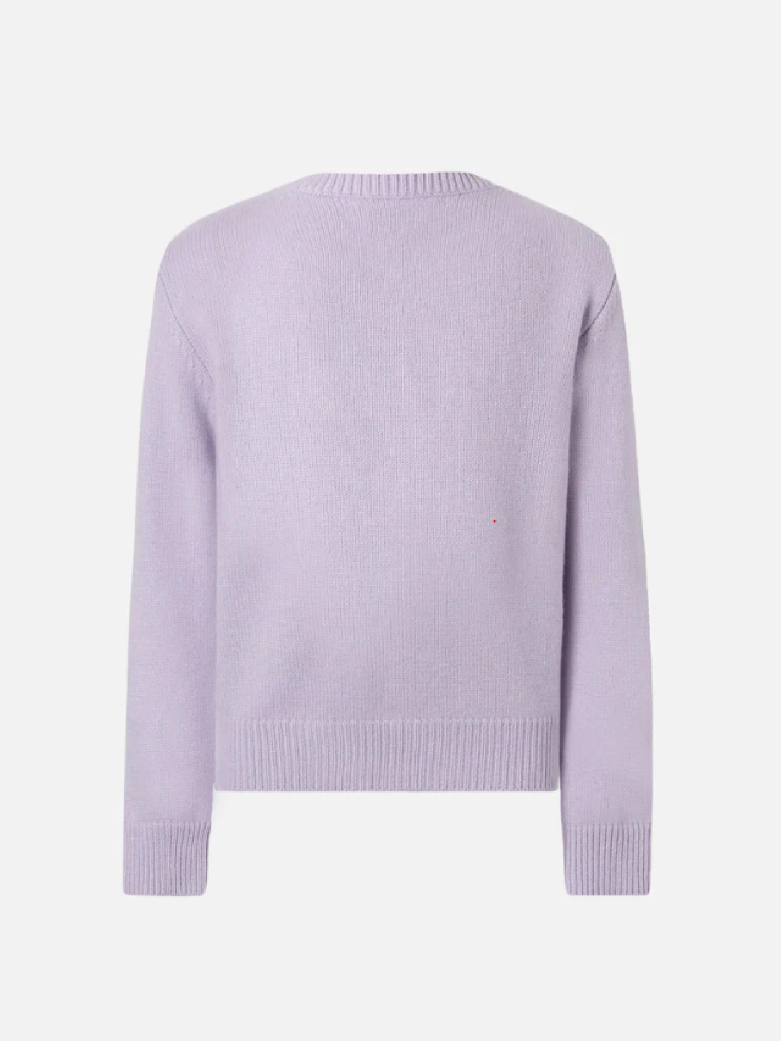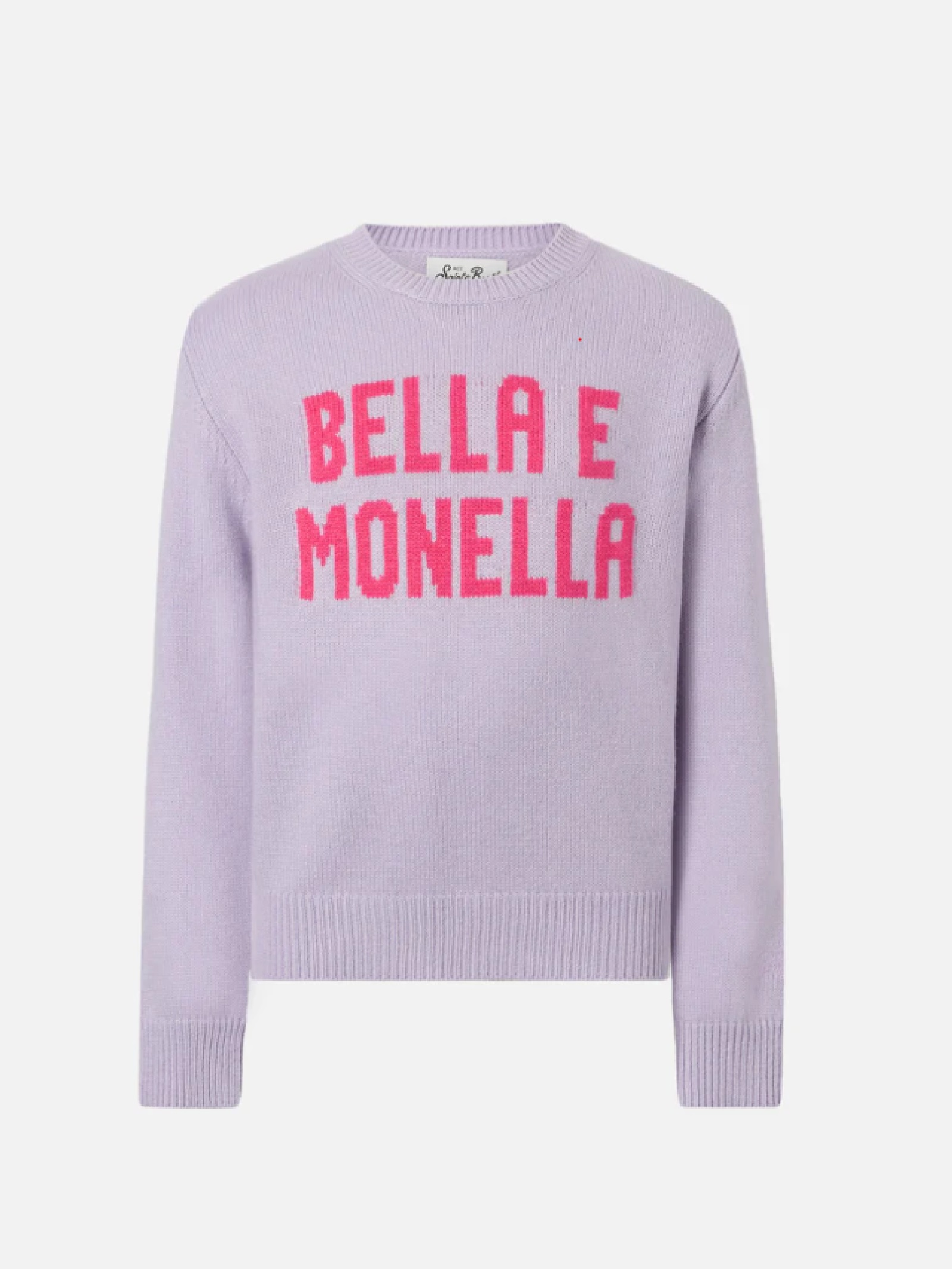 Maglione MC2 Saint Barth in misto cashmere, realizzato con finezza 7gg e lavorazione a maglia rasata per un comfort morbido e raffinato. Modello girocollo dalla vestibilità regolare, impreziosito dal ricamo St. Barth sul polso. La tinta unita lilla e il jacquard Bella e Monella aggiungono un tocco di stile unico, ideale per look casual e sofisticati.