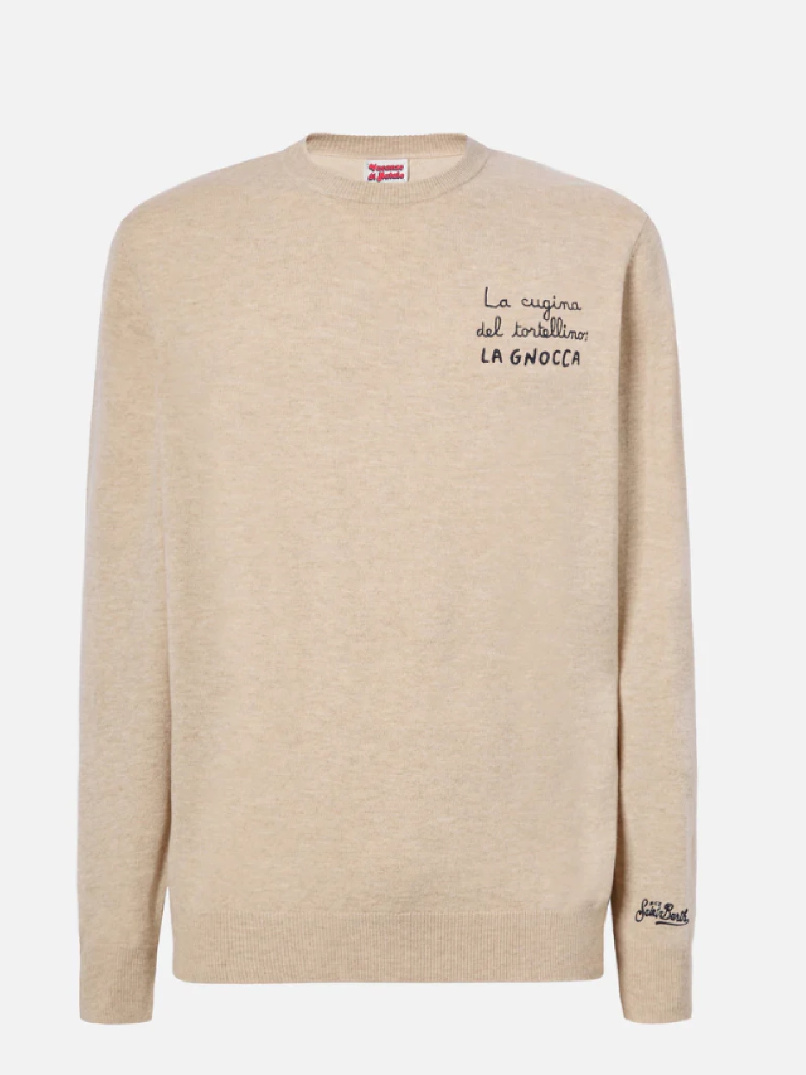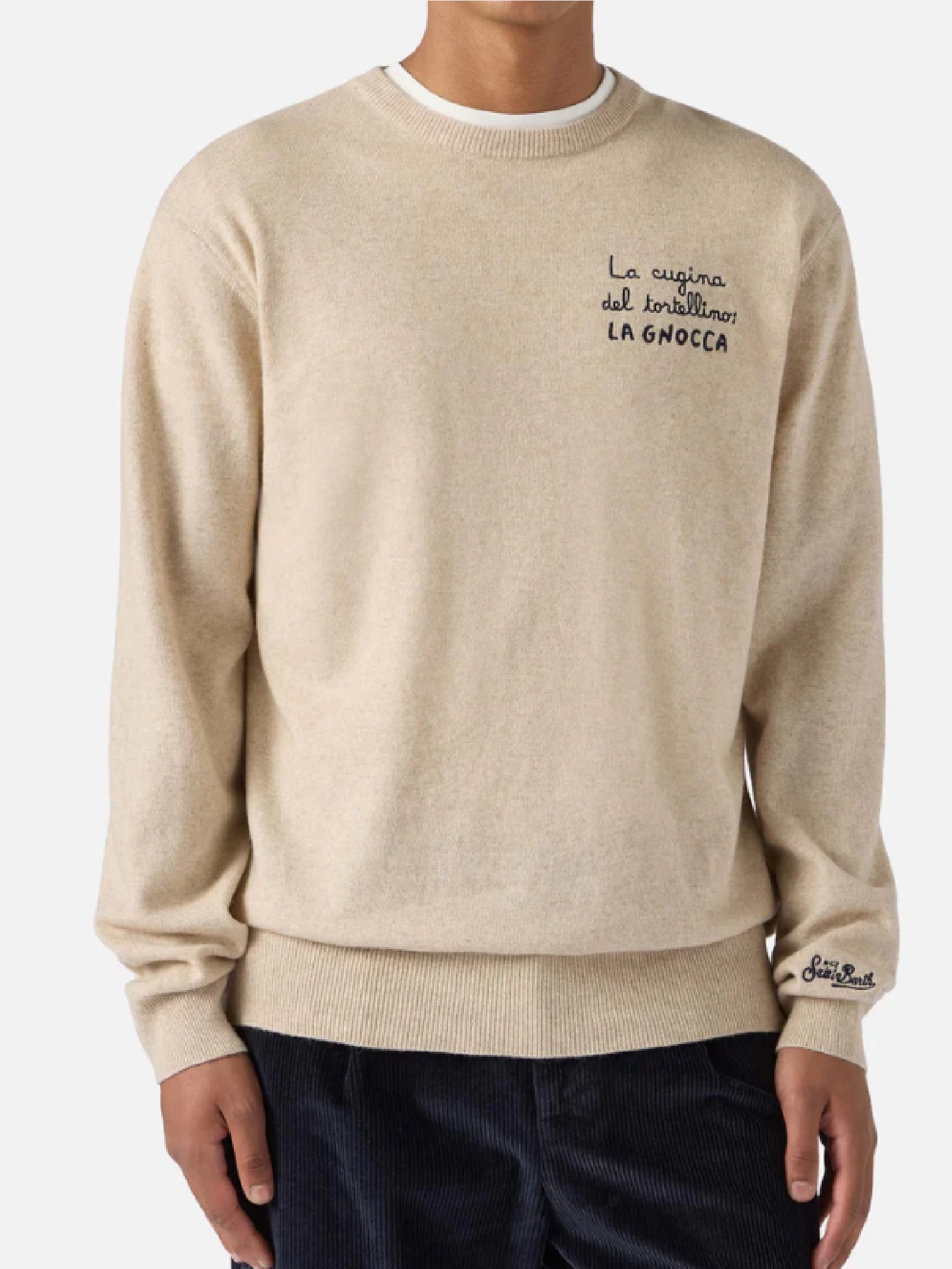 Maglione MC2 Saint Barth in morbido misto cashmere, finezza 12 e maglia rasata per un comfort raffinato. Modello girocollo con vestibilità regolare, fondo e polsi a coste. La tinta unita beige è valorizzata dal ricamo St. Barth sul polso e dalla scritta divertente La cugina del tortellino, la gnocca! a punto cuore, per un look ironico e di tendenza.