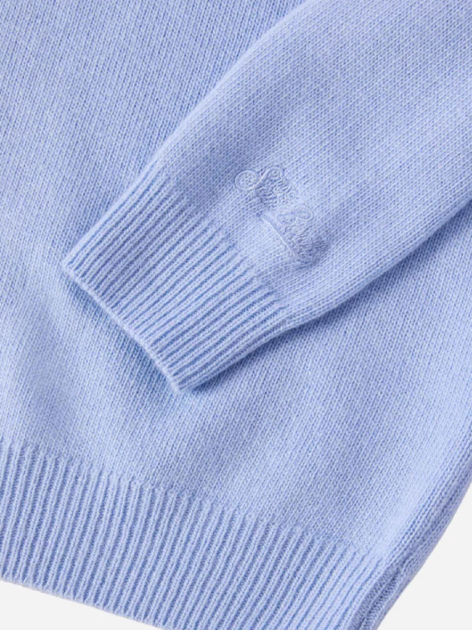 Maglione girocollo Douglas MC2 Saint Barth da bambino, in morbido cotone con collo, polsini e orlo a coste per un comfort perfetto. Design azzurro a tinta unita con scritta jacquard Tutto il papà e logo Saint Barth ricamato sul polsino. Vestibilità regolare e stile versatile, ideale per look casual e alla moda in ogni occasione.