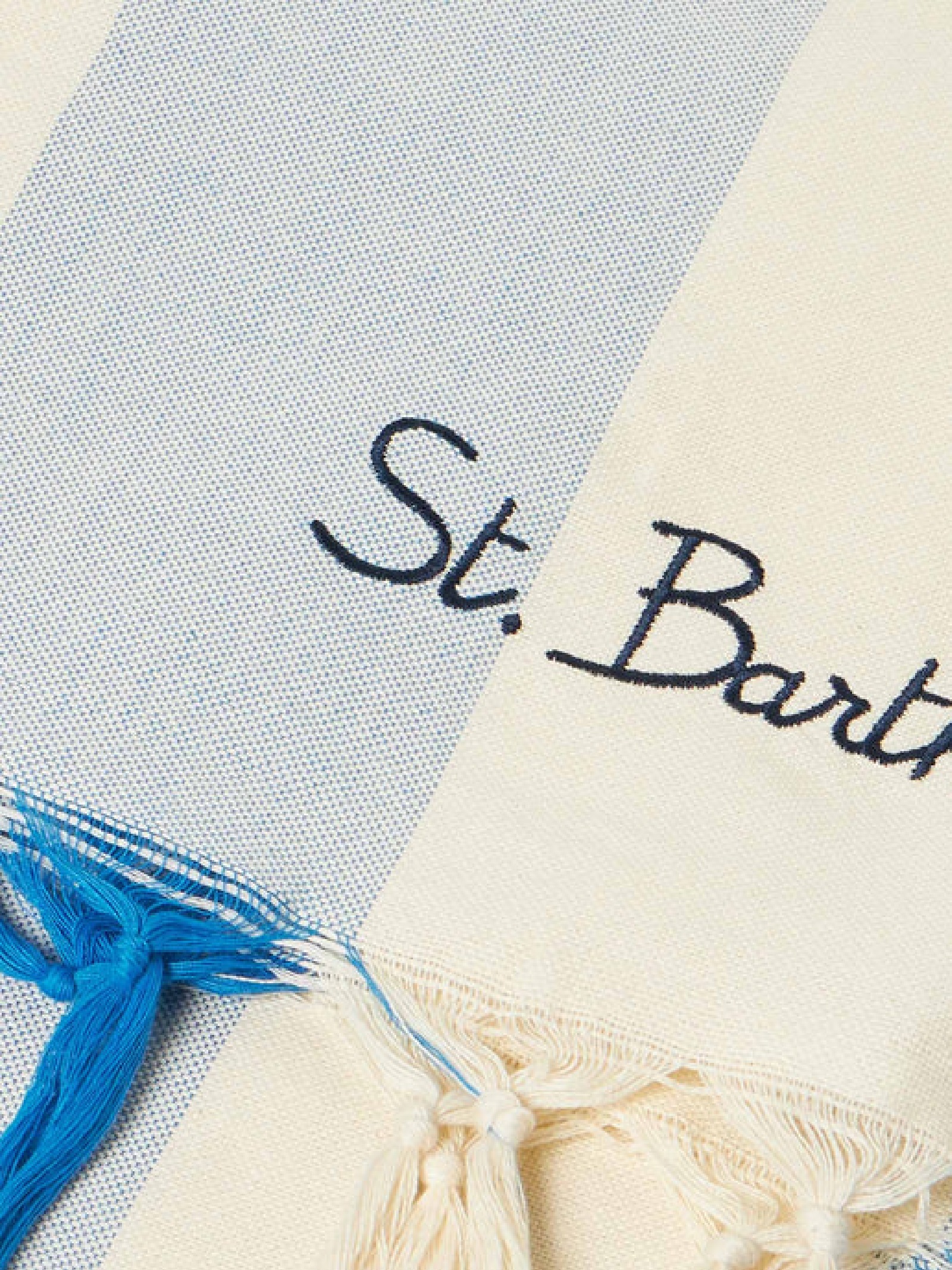 Fouta leggero con frange, arricchito dal ricamo rosso St. Barth e strisce bianche e blu. Realizzato al 100% in cotone, misura 1 metro per 2 metri.