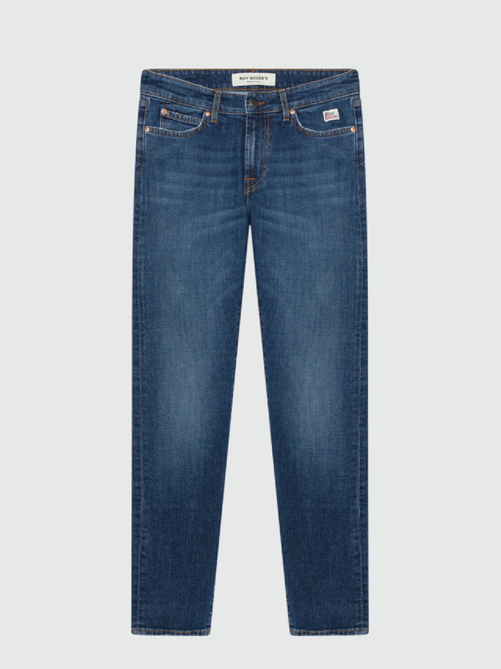 Jeans Roy Roger's da uomo in denim con lavaggio scuro, perfetti per uno stile casual contemporaneo. Modello slim fit con vita media, passanti per cintura, chiusura con bottone logato e zip. Design classico a cinque tasche con label Roy Rogers sul retro e salpa applicata. Realizzati in Italia in denim stretch confortevole.