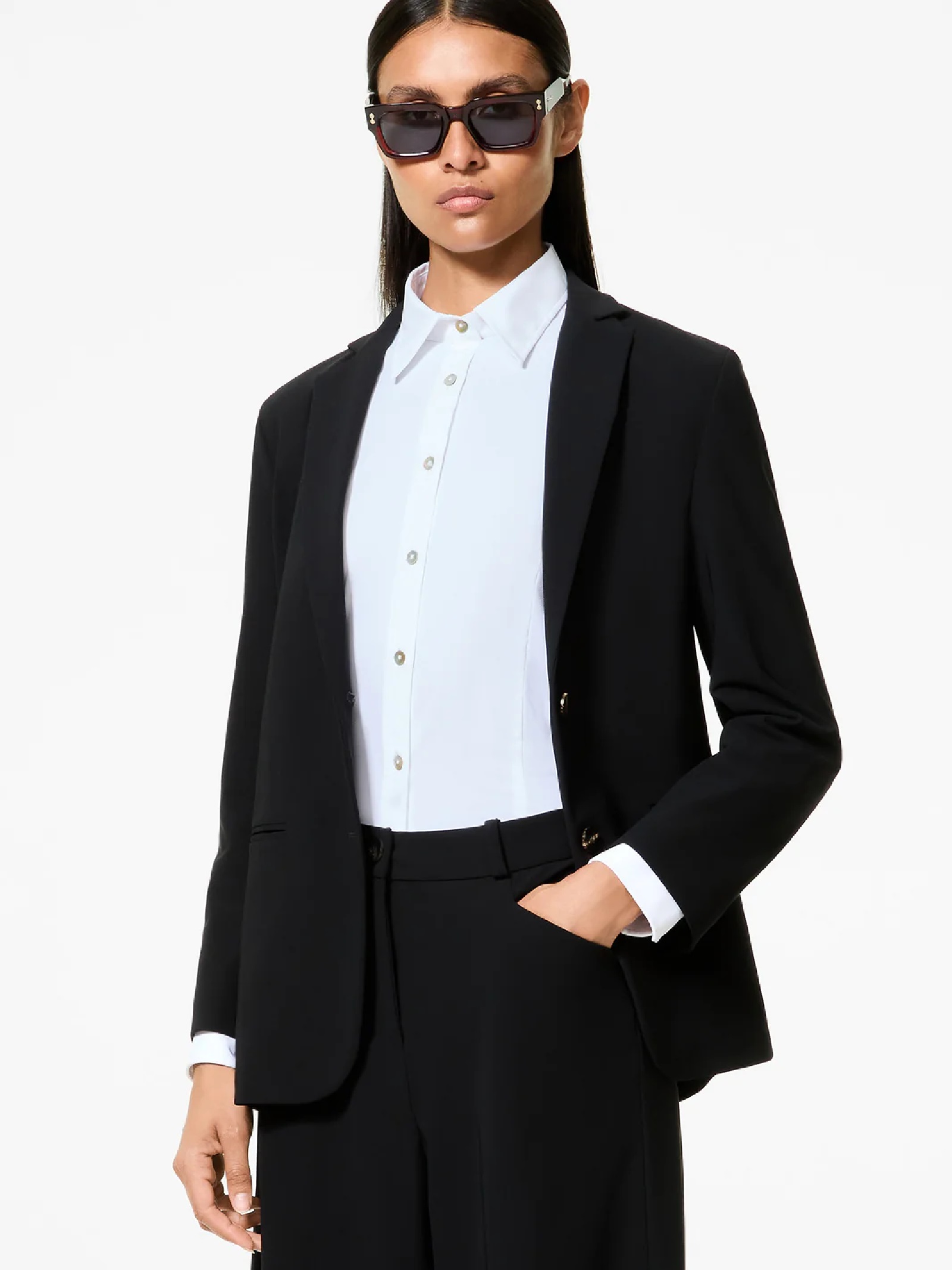 Blazer monopetto RRD donna dal taglio maschile e silhouette leggermente over, elegante e contemporaneo. Realizzato in tessuto SURFLEX® stretch, leggero e antipiega, offre comfort sofisticato e vestibilità fluida. Linee pulite, tasche a filetto e costruzione impeccabile valorizzano lo stile minimal chic. Perfetto per lufficio, i viaggi o look casual chic, questo blazer RRD è un passe-partout di lusso che unisce classe, modernità e disinvoltura.